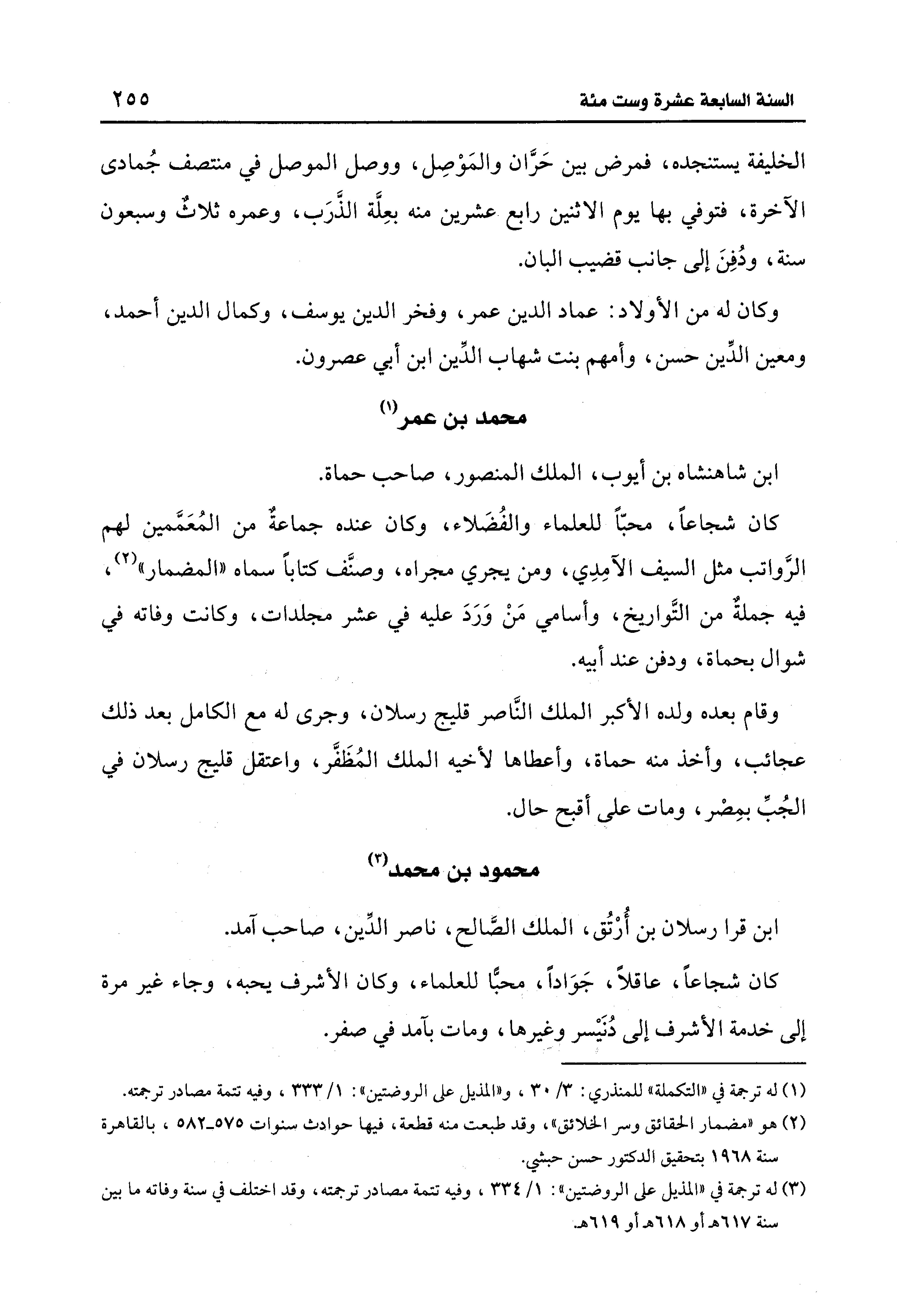كان شجاعًا، محبًّا للعلماء والفُضَلاء، وكان عنده جماعةٌ من المُعَمَّمين لهم الرَّواتب مثل السيف الآمِدِي، ومن يجري مجراه، وصنَّف كتابًا سماه "المضمار" (¬2)، فيه جملةٌ من التَّواريخ، وأسامي مَنْ وَرَدَ عليه في عشر مجلدات، وكانت وفاته في شوال بحماة، ودفن عند أَبيه.