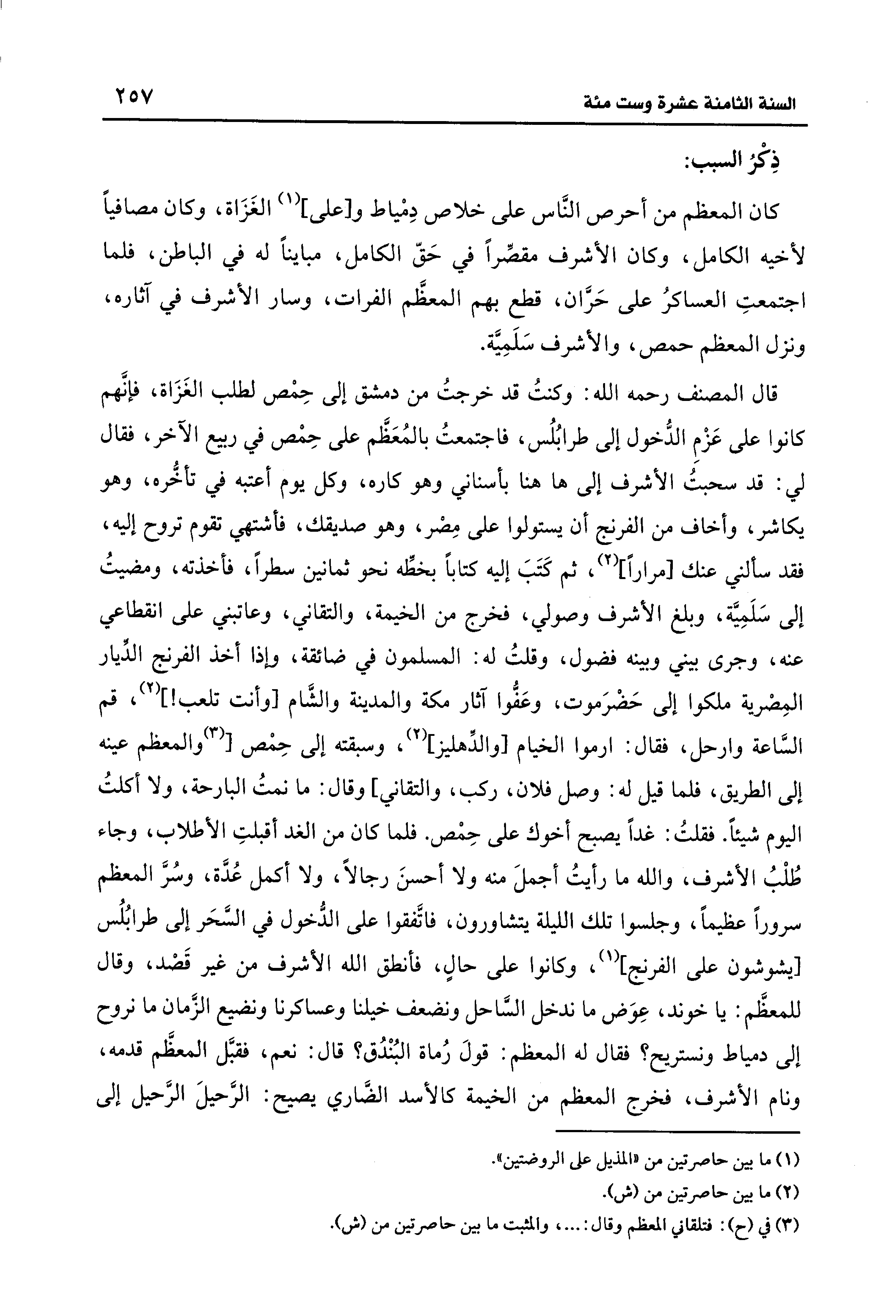 قال المصنف رحمه الله: وكنتُ قد خرجتُ من دمشق إلى حِمْص لطلب الغَزَاة، فإنَّهم كانوا على عَزْمِ الدُّخول إلى طرابُلُس، فاجتمعتُ بالمُعَظَّم على حِمْص في ربيع الآخر، فقال لي: قد سحبتُ الأشرف إلى ها هنا بأسناني وهو كاره، وكل يوم أعتبه في تأخُّره، وهو يكاشر، وأخاف من الفرنج أن يستولوا على مِصْر، وهو صديقك، فأشتهي تقوم تروح إليه، فقد سألني عنك [مرارًا] (¬2)، ثم كَتَبَ إليه كتابًا بخطِّه نحو ثمانين سطرًا، فأخذته، ومضيتُ إلى سَلَمِيَّة، وبلغ الأشرف وصولي، فخرج من الخيمة، والتقاني، وعاتبني على انقطاعي عنه، وجرى بيني وبينه فضول، وقلتُ له: المسلمون في ضائقة، وإذا أخذ الفرنج الدِّيار المِصْرية ملكوا إلى حَضْرَ موت، وعَفُّوا آثار مكة والمدينة والشَّام [وأنت تلعب! ] (2)، قم السَّاعة وارحل، فقال: ارموا الخيام [والدِّهليز] (2)، وسبقته إلى حِمْص [(¬3) والمعظم عينه إلى الطريق، فلما قيل له: وصل فلان، ركب، والتقاني] وقال: ما نمتُ البارحة، ولا أكلتُ اليوم شيئًا. فقلتُ: غدًا يصبح أخوك على حِمْص. فلما كان من الغد أقبلتِ الأطلاب، وجاء طُلْبُ الأشرف، والله ما رأيتُ أجملَ منه ولا أحسنَ رجالًا، ولا أكمل عُدَّة، وسُرَّ المعظم سرورًا عظيمًا، وجلسوا تلك الليلة يتشاورون، فاتَّفقوا على الدُّخول في السَّحَر إلى طرابُلُس [يشوشون على الفرنج] (1)، وكانوا على حالٍ، فأنطق الله الأشرف من غير قَصْد، وقال للمعظَّم: يَا خوند، عِوَض ما ندخل السَّاحل ونضعف خيلنا وعساكرنا ونضيع الزَّمان ما نروح إلى دمياط ونستريح؟ فقال له المعظم: قولَ رُماة البُنْدُق؟ قال: نعم، فقبَّل المعظَّم قدمه، ونام الأشرف، فخرج المعظم من الخيمة كالأسد الضَّاري يصيح: الرَّحيلَ الرَّحيل إلى