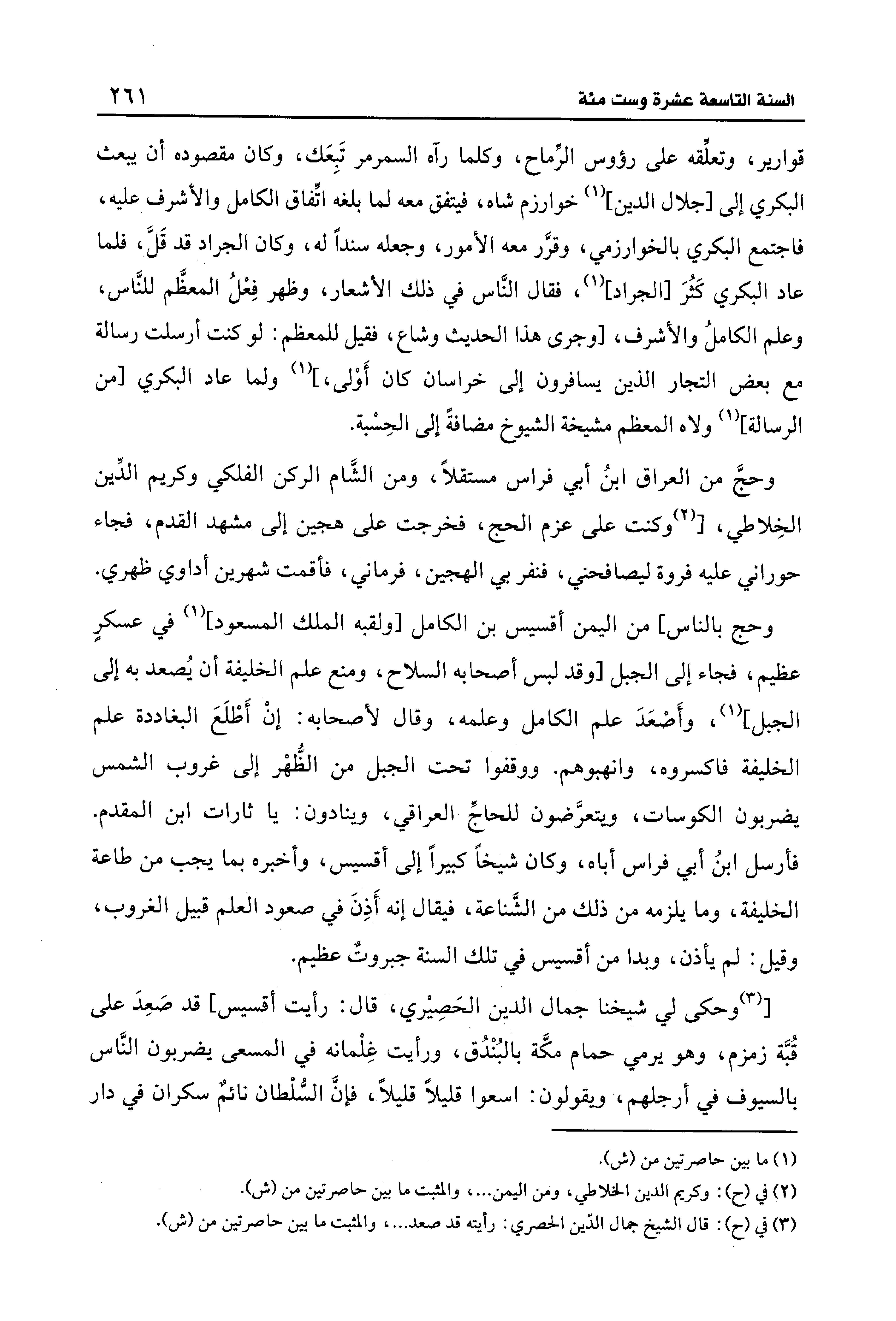 وحجَّ من العراق ابنُ أبي فراس مستقلًا، ومن الشَّام الركن الفلكي وكريم الدِّين الخِلاطي، [(¬2) وكنت على عزم الحج، فخرجت على هجين إلى مشهد القدم، فجاء حوراني عليه فروة ليصافحني، فنفر بي الهجين، فرماني، فأقمت شهرين أداوي ظهري.