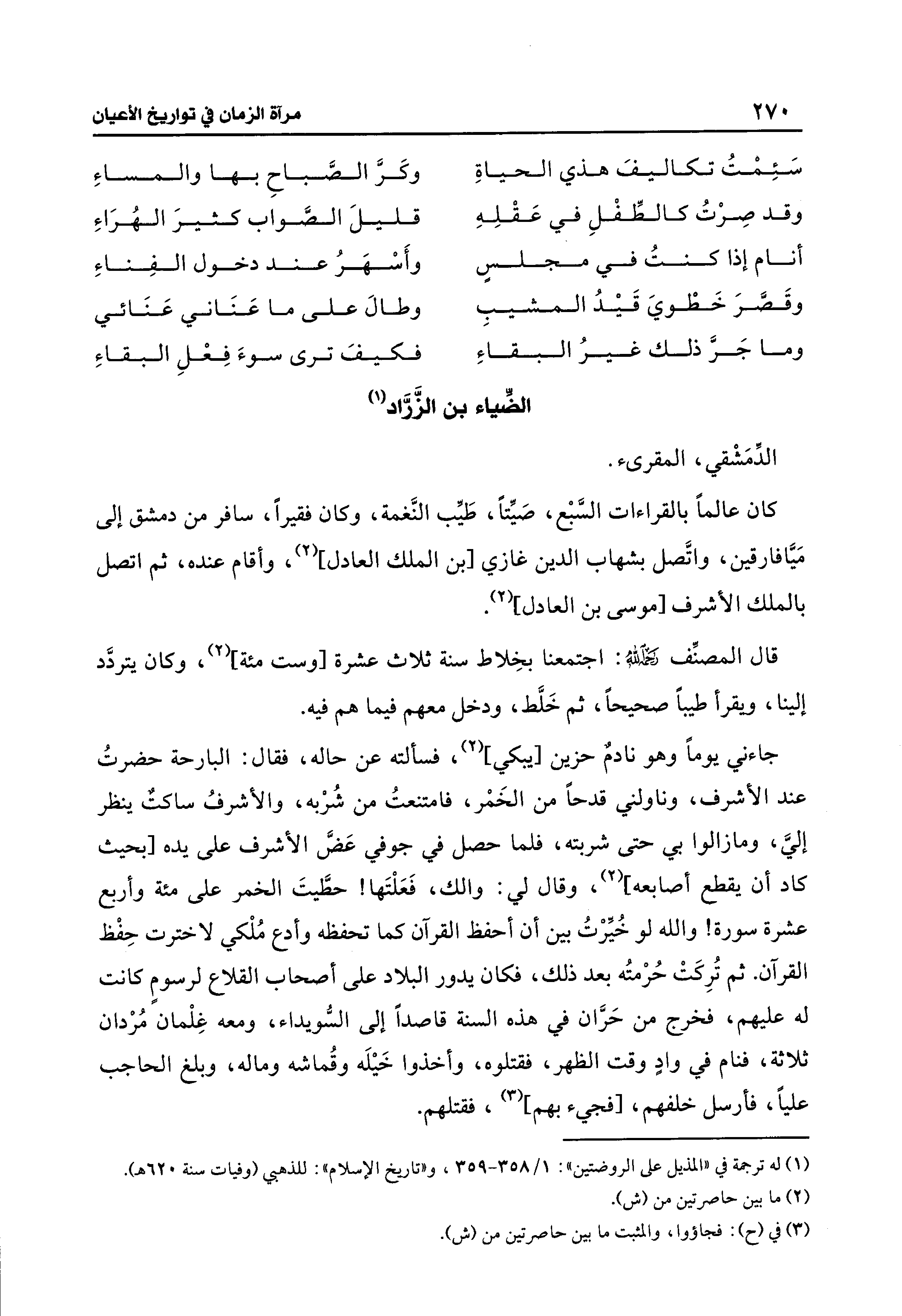 جاءني يومًا وهو نادمٌ حزين [يبكي] (2)، فسألته عن حالة، فقال: البارحة حضرتُ عند الأشرف، وناولني قدحًا من الخَمْر، فامتنعتُ من شُرْبه، والأشرفُ ساكتٌ ينظر إليَّ، وما زالوا بي حتَّى شربته، فلما حصل في جوفي عَضَّ الأشرف على يده [بحيث كاد أن يقطع أصابعه] (2)، وقال لي: والك، فَعَلْتَها! حطَّيتَ الخمر على مئة وأربع عشرة سورة! والله لو خُيِّرْتُ بين أن أحفظ القرآن كما تحفظه وأدع مُلْكي لاخترت حِفْظ القرآن. ثم تُرِكَتْ حُرْمتُه بعد ذلك، فكان يدور البلاد على أصحاب القلاع لرسومٍ كانت له عليهم، فخرج من حَرَّان في هذه السنة قاصدًا إلى السُّويداء، ومعه غِلْمان مُرْدان ثلاثة، فنام في وادٍ وقت الظهر، فقتلوه، وأخذوا خَيلَه وقُماشه وماله، وبلغ الحاجب عليًّا، فأرسل خلفهم، [فجيء بهم] (¬3)، فقتلهم.