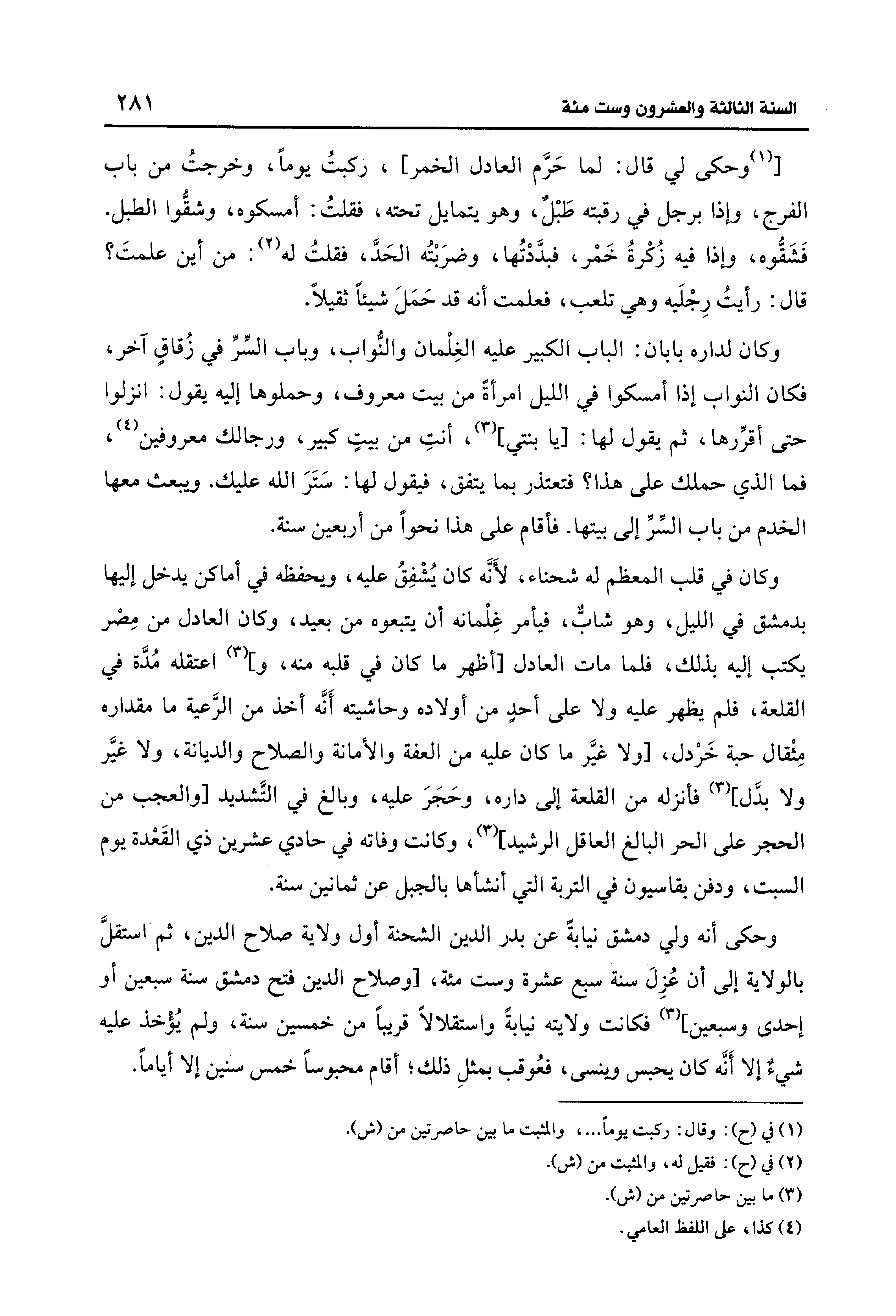 وكان لداره بابان: الباب الكبير عليه الغِلْمان والنُّواب، وباب السِّرِّ في زُقاقٍ آخر، فكان النواب إذا أمسكوا في الليل امرأةً من بيت معروف، وحملوها إليه يقول: انزلوا حتَّى أقرّرها، ثم يقول لها: [يا بنتي] (¬3)، أنتِ من بيتٍ كبير، ورجالك معروفين (¬4)، فما الذي حملك على هذا؟ فتعتذر بما يتفق، فيقول لها: سَتَرَ الله عليك. ويبعث معها الخدم من باب السِّرِّ إلى بيتها. فأقام على هذا نحوًا من أربعين سنة.