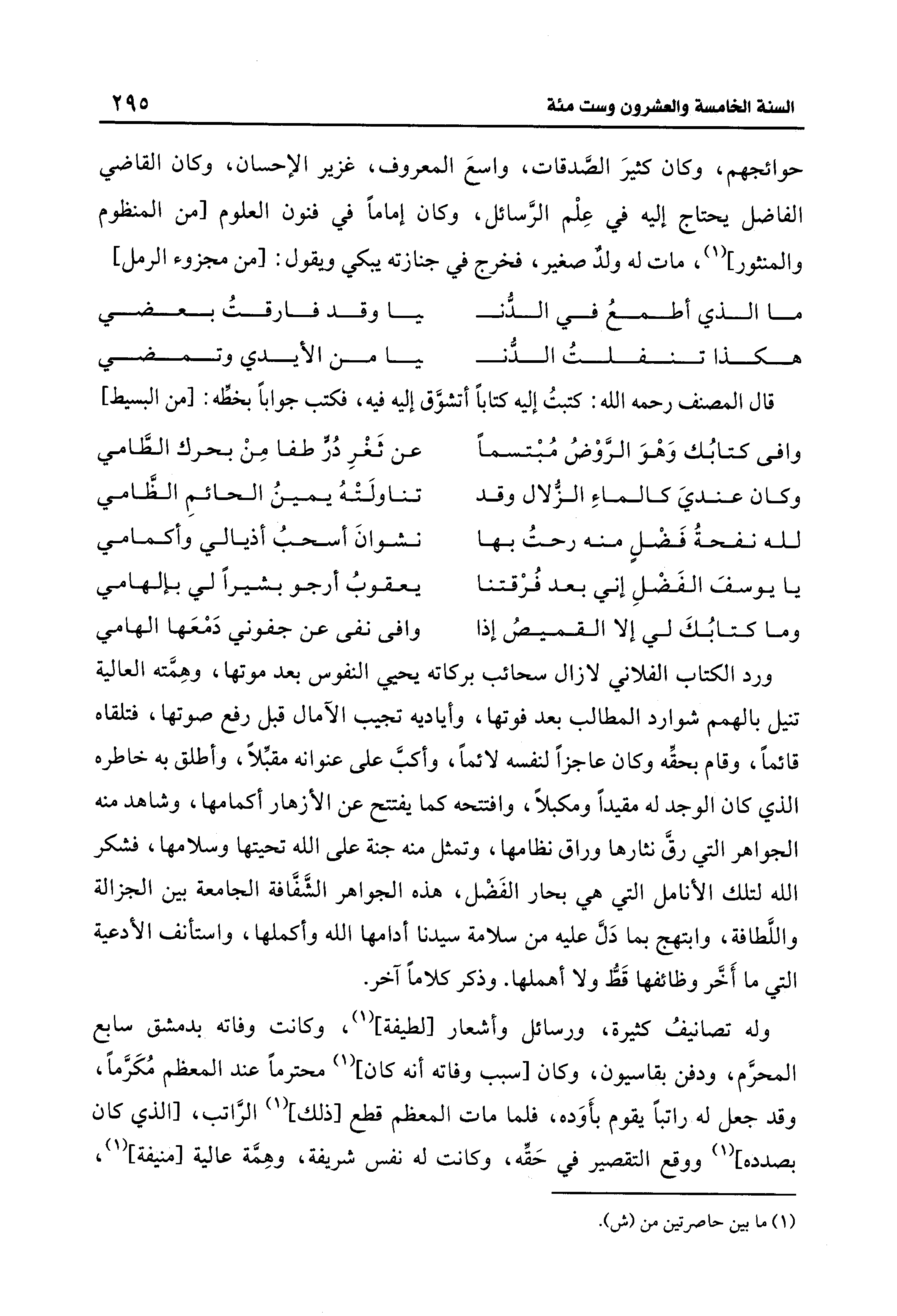 حوائجهم، وكان كثيرَ الصَّدقات، واسعَ المعروف، غزير الإحسان، وكان القاضي الفاضل يحتاج إليه في عِلْم الرَّسائل، وكان إمامًا في فنون العلوم [من المنظوم والمنثور] (¬1)، مات له ولدٌ صغير، فخرج في جنازته يبكي ويقول: [من مجزوء الرمل]