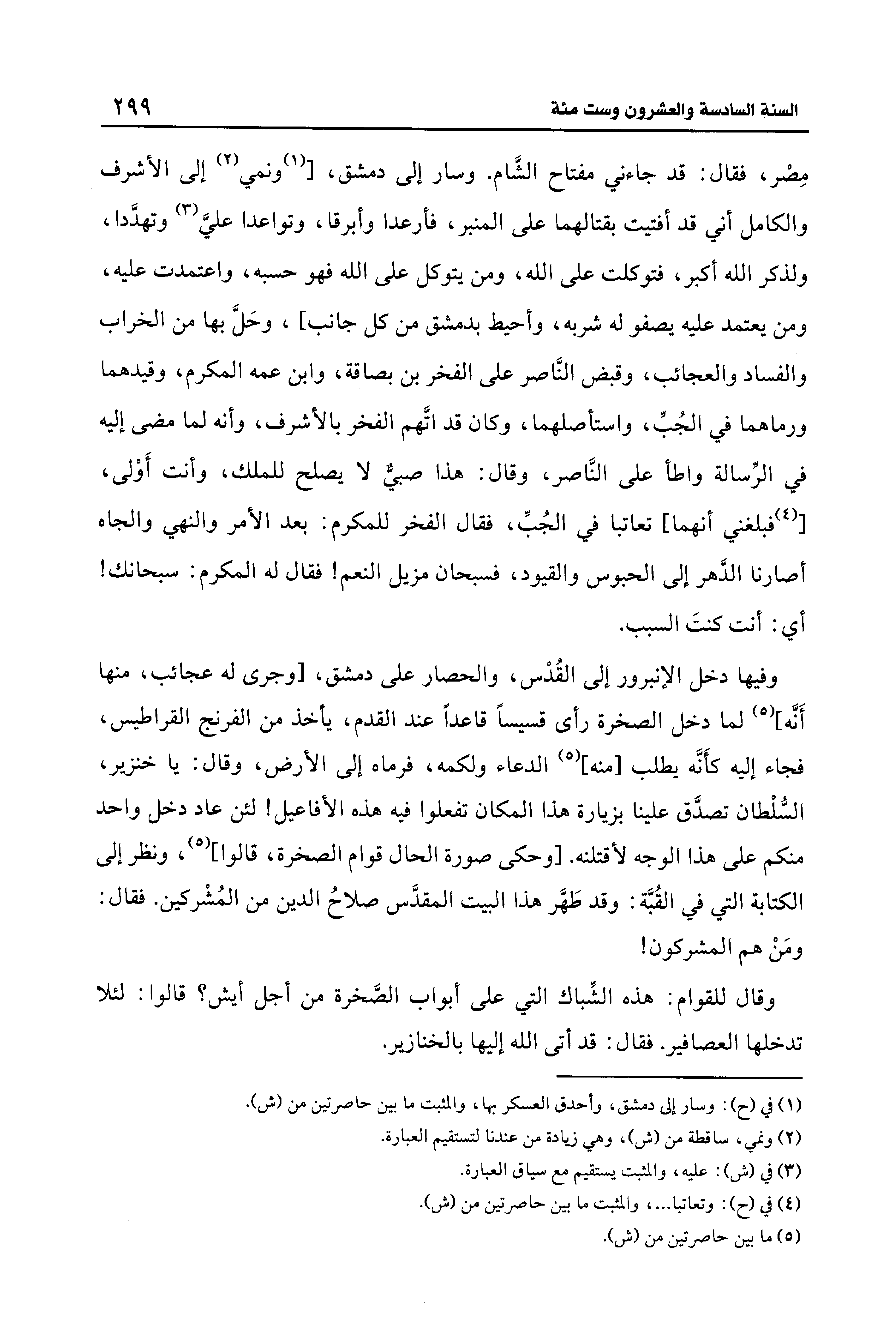 مِصْر، فقال: قد جاءني مفتاح الشَّام. وسار إلى دمشق، [(¬1) ونمي (¬2) إلى الأشرف والكامل أني قد أفتيت بقتالهما على المنبر، فأرعدا وأبرقا، وتواعدا عليَّ (¬3) وتهدَّدا، ولذكر الله أكبر، فتوكلت على الله، ومن يتوكل على الله فهو حسبه، واعتمدت عليه، ومن يعتمد عليه يصفو له شربه، وأحيط بدمشق من كل جانب]، وحَلَّ بها من الخراب والفساد والعجائب، وقبض النَّاصر على الفخر بن بصاقة، وابن عمه المكرم، وقيدهما ورماهما في الجُبِّ، واستأصلهما، وكان قد اتَّهم الفخر بالأشرف، وأنه لما مضى إليه في الرِّسالة واطأ على النَّاصر، وقال: هذا صبيٌّ لا يصلح للملك، وأنت أَوْلى، [(¬4) فبلغني أنهما] تعاتبا في الجُبِّ، فقال الفخر للمكرم: بعد الأمر والنهي والجاه أصارنا الدَّهر إلى الحبوس والقيود، فسبحان مزيل النعم! فقال له المكرم: سبحانك! أي: أنت كنتَ السبب.