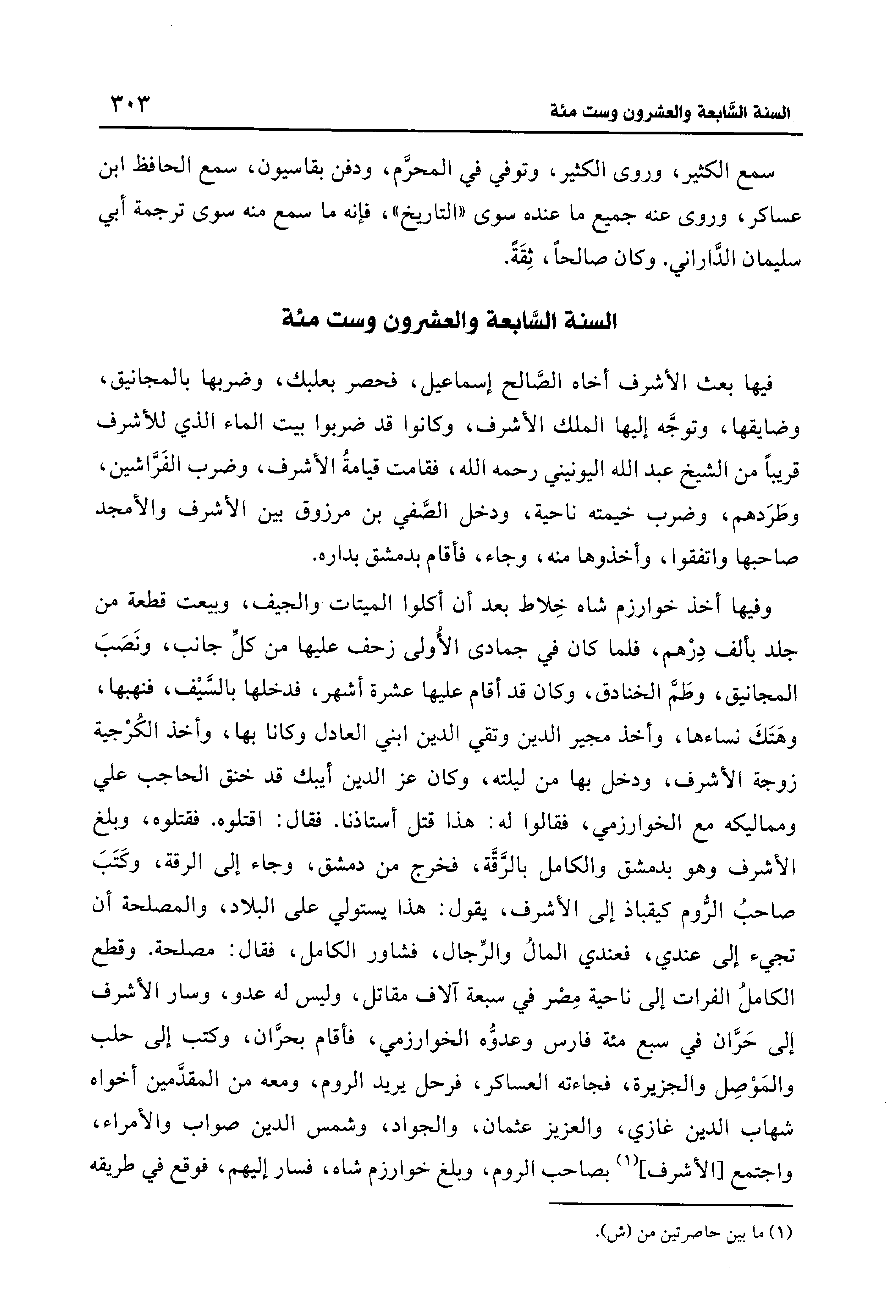 فيها بعث الأشرف أخاه الصَّالح إسماعيل، فحصر بعلبك، وضربها بالمجانيق، وضايقها، وتوجَّه إليها الملك الأشرف، وكانوا قد ضربوا بيت الماء الذي للأشرف قريبًا من الشيخ عبد الله اليونيني رحمه الله، فقامت قيامةُ الأشرف، وضرب الفَرَّاشين، وطَرَدهم، وضرب خيمته ناحية، ودخل الصَّفي بن مرزوق بين الأشرف والأمجد صاحبها واتفقوا، وأخذوها منه، وجاء، فأقام بدمشق بداره.