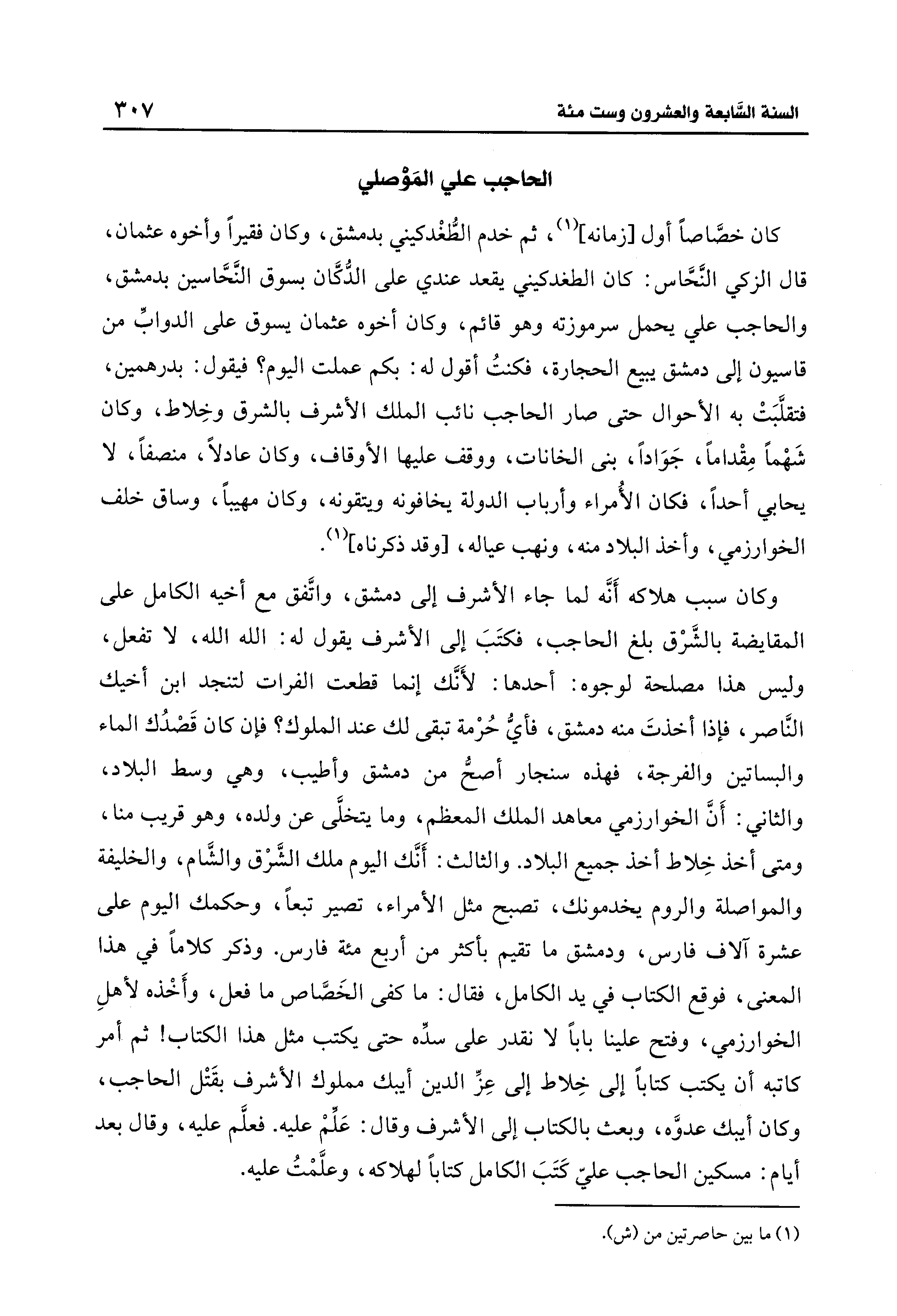 كان خصَّاصًا أول [زمانه] (¬1)، ثم خدم الطُّغْدكيني بدمشق، وكان فقيرًا وأخوه عثمان، قال الزكي النَّحَّاس: كان الطغدكيني يقعد عندي على الدُّكَّان بسوق النَّحَّاسين بدمشق، والحاجب علي يحمل سرموزته وهو قائم، وكان أخوه عثمان يسوق على الدوابِّ من قاسيون إلى دمشق يبيع الحجارة، فكنتُ أقول له: بكم عملت اليوم؟ فيقول: بدرهمين، فتقلَّبَتْ به الأحوال حتى صار الحاجب نائب الملك الأشرف بالشرق وخِلاط، وكان شَهْمًا مِقْدامًا، جَوَادًا، بنى الخانات، ووقف عليها الأوقاف، وكان عادلًا، منصفًا، لا يحابي أحدًا، فكان الأُمراء وأرباب الدولة يخافونه ويتقونه، وكان مهيبًا، وساق خلف الخوارزمي، وأخذ البلاد منه، ونهب عياله، [وقد ذكرناه] (1).