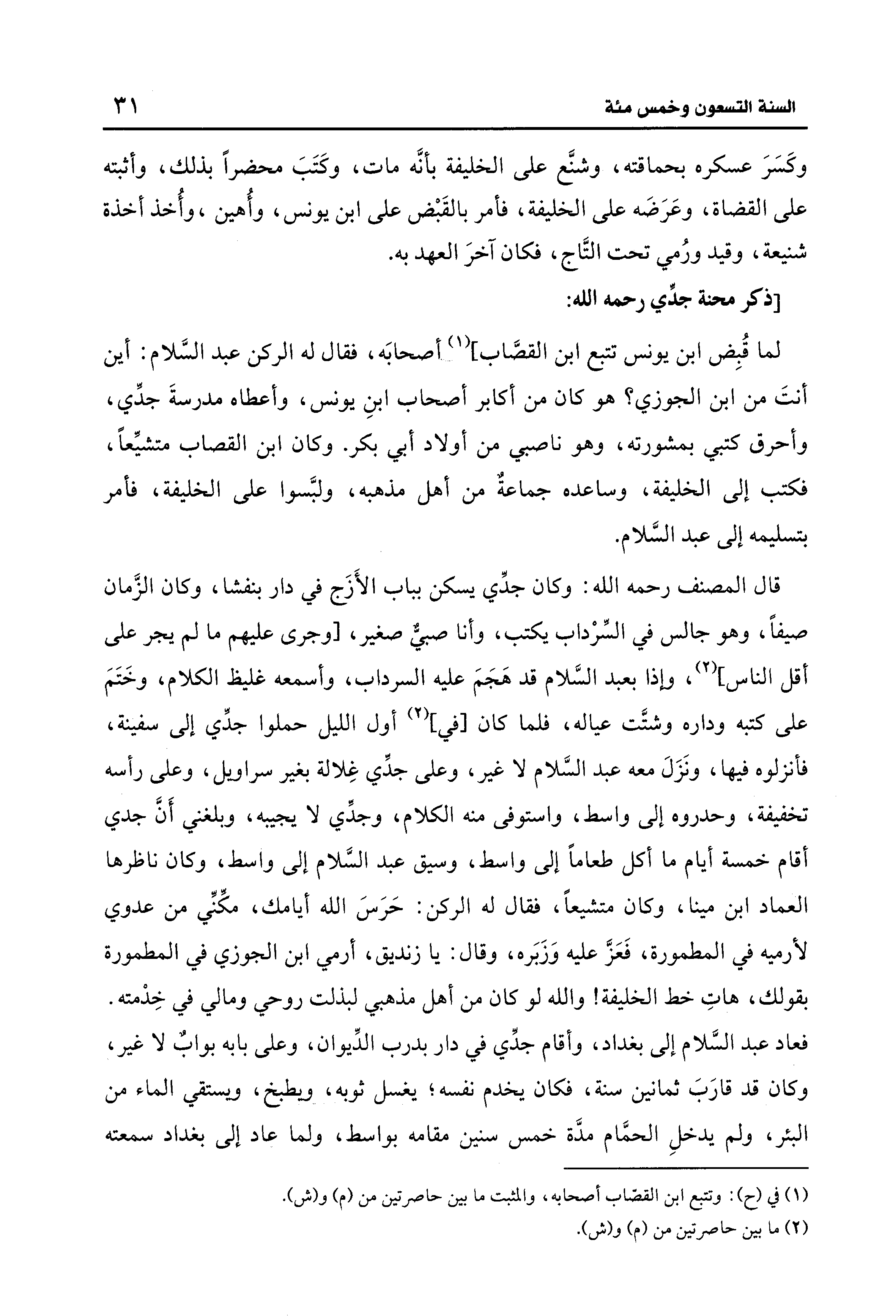 قال المصنف رحمه الله: وكان جدِّي يسكن بباب الأَزَج في دار بنفشا، وكان الزَّمان صيفًا، وهو جالس في السِّرْداب يكتب، وأنا صبيٌّ صغير، [وجرى عليهم ما لم يجر على أقل الناس] (2)، وإذا بعبد السَّلام قد هَجَمَ عليه السرداب، وأسمعه غليظ الكلام، وخَتَمَ على كتبه وداره وشتَّت عياله، فلما كان [في] (¬2) أول الليل حملوا جدِّي إلى سفينة، فأنزلوه فيها، ونَزَلَ معه عبد السَّلام لا غير، وعلى جدِّي غِلالة بغير سراويل، وعلى رأسه تخفيفة، وحدروه إلى واسط، واستوفى منه الكلام، وجدِّي لا يجيبه، وبلغني أَنَّ جدي أقام خمسة أيام ما أكل طعامًا إلى واسط، وسيق عبد السلام إلى واسط، وكان ناظرها العماد ابن مينا، وكان متشيعًا، فقال له الركن: حَرَسَ الله أيامك، مكِّنِّي من عدوي لأرميه في المطمورة، فَعَزَّ عليه وَزَبَره، وقال: يا زنديق، أرمي ابن الجوزي في المطمورة بقولك، هاتِ خط الخليفة! والله لو كان من أهل مذهبي لبذلت روحي ومالي في خِدْمته. فعاد عبد السَّلام إلى بغداد، وأقام جدِّي في دار بدرب الدِّيوان، وعلى بابه بوابٌ لا غير، وكان قد قارَبَ ثمانين سنة، فكان يخدم نفسه؛ يغسل ثوبه، ويطبخ، ويستقي الماء من البئر، ولم يدخلِ الحمَّام مدَّة خمس سنين مقامه بواسط، ولما عاد إلى بغداد سمعته