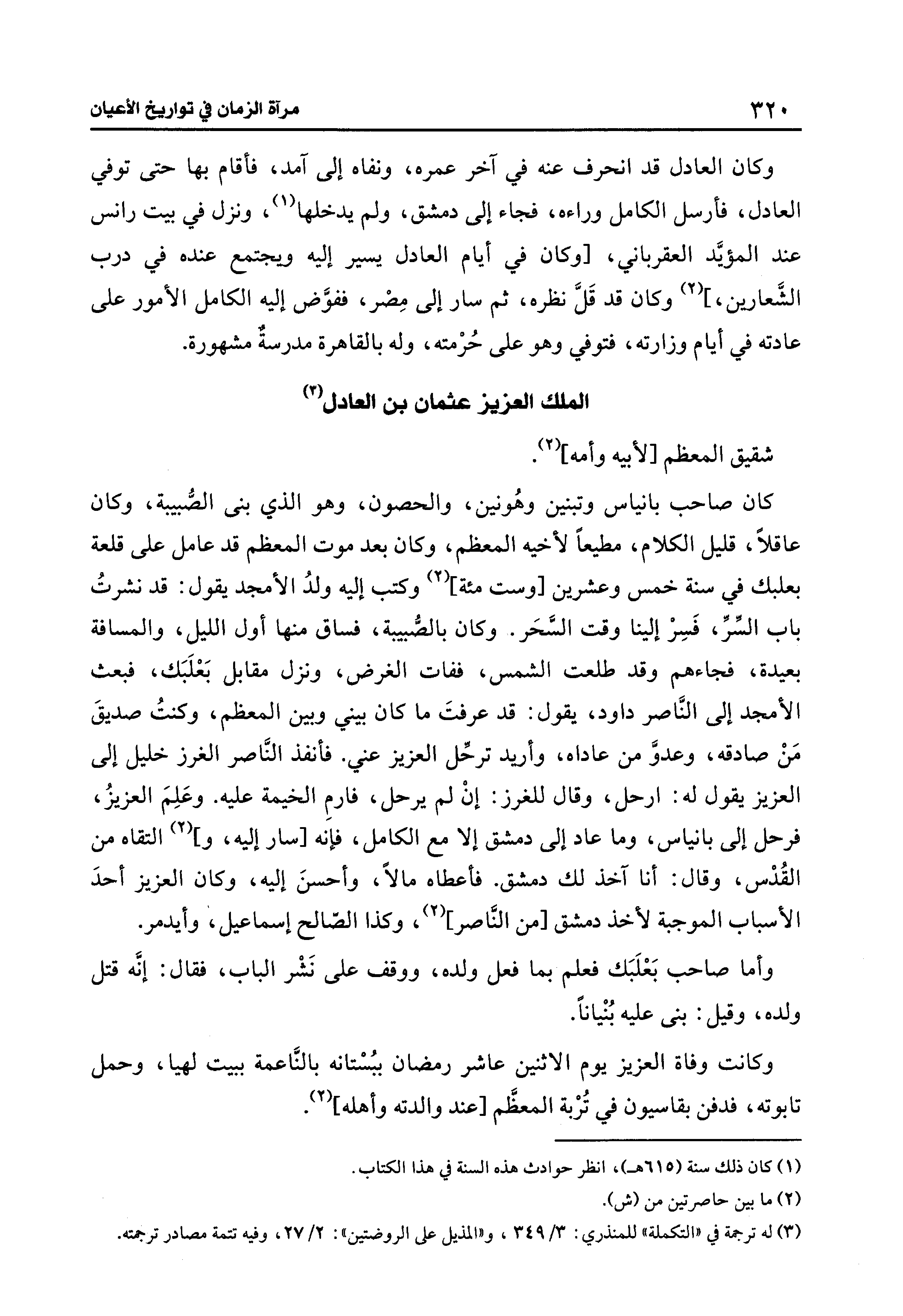 كان صاحب بانياس وتبنين وهُونين، والحصون، وهو الذي بنى الصُّبيبة، وكان عاقلًا، قليل الكلام، مطيعًا لأخيه المعظم، وكان بعد موت المعظم قد عامل على قلعة بعلبك في سنة خمس وعشرين [وست مئة] (2) وكتب إليه ولدُ الأمجد يقول: قد نشرتُ باب السِّرِّ، فَسِرْ إلينا وقت السَّحَر. وكان بالصُّبيبة، فساق منها أول الليل، والمسافة بعيدة، فجاءهم وقد طلعت الشمس، ففات الغرض، ونزل مقابل بَعْلَبَك، فبعث الأمجد إلى النَّاصر داود، يقول: قد عرفتَ ما كان بيني وبين المعظم، وكنتُ صديقَ مَنْ صادقه، وعدوَّ من عاداه، وأريد ترحِّل العزيز عني. فأنفذ النَّاصر الغرز خليل إلى العزيز يقول له: ارحل، وقال للغرز: إنْ لم يرحل، فارمِ الخيمة عليه. وعَلِمَ العزيزُ، فرحل إلى بانياس، وما عاد إلى دمشق إلا مع الكامل، فإنه [سار إليه، و] (2) التقاه من القُدْس، وقال: أنا آخذ لك دمشق. فأعطاه مالًا، وأحسنَ إليه، وكان العزيز أحدَ الأسباب الموجبة لأخذ دمشق [من النَّاصر] (2)، وكذا الصَّالح إسماعيل، وأيدمر.