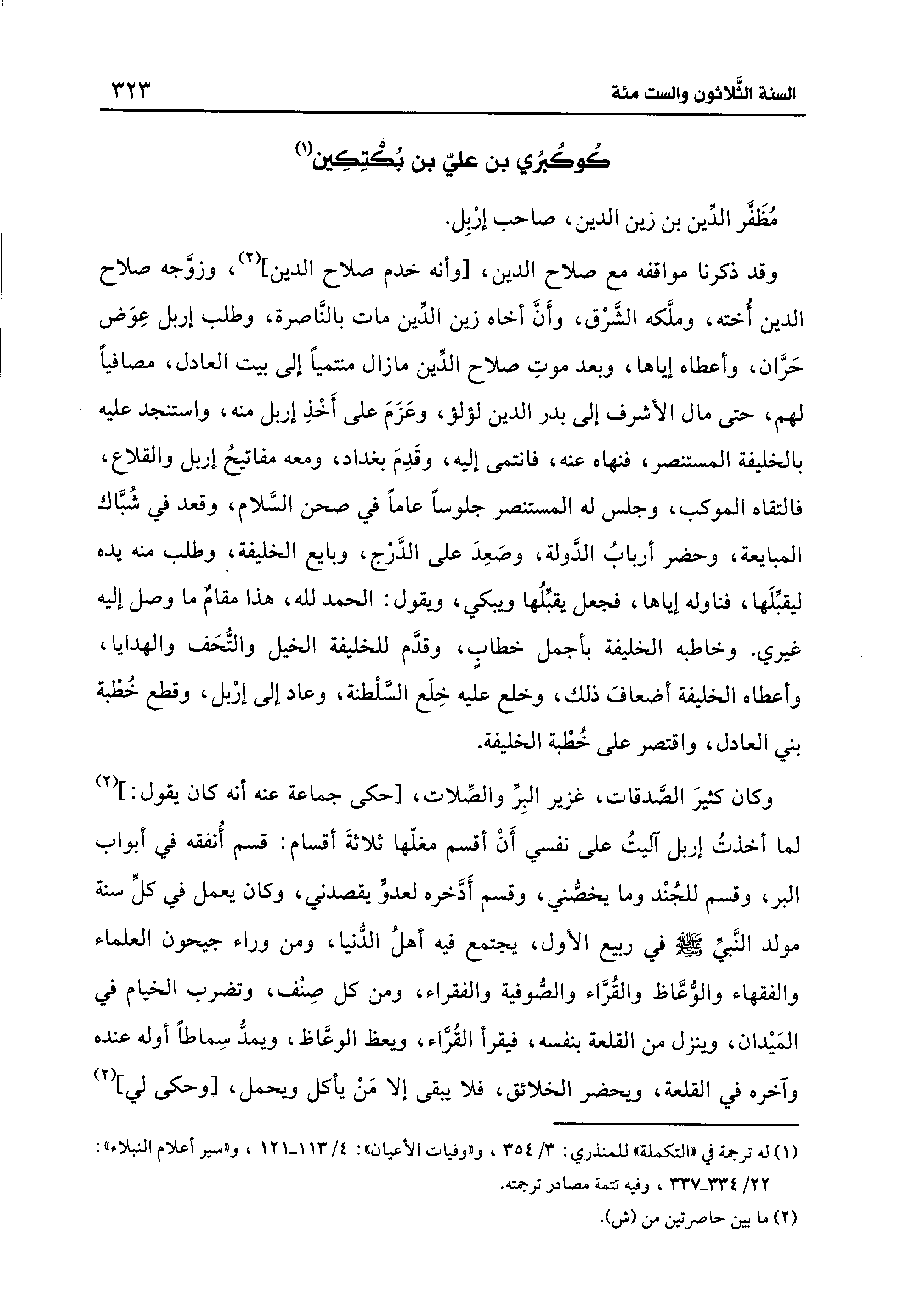 وقد ذكرنا مواقفه مع صلاح الدين، [وأنه خدم صلاح الدين] (2)، وزوَّجه صلاح الدين أُخته، وملَّكه الشَّرْق، وأَنَّ أخاه زين الدِّين مات بالنَّاصرة، وطلب إربل عِوَض حَرَّان، وأعطاه إياها، وبعد موتِ صلاح الدِّين ما زال منتميًا إلى بيت العادل، مصافيًا لهم، حتى مال الأشرف إلى بدر الدين لؤلؤ، وعَزَمَ على أَخْذِ إربل منه، واستنجد عليه بالخليفة المستنصر، فنهاه عنه، فانتمى إليه، وقَدِمَ بغداد، ومعه مفاتيحُ إربل والقلاع، فالتقاه الموكب، وجلس له المستنصر جلوسًا عامًا في صحن السَّلام، وقعد في شُبَّاك المبايعة، وحضر أربابُ الدَّولة، وصَعِدَ على الدَّرْج، وبايع الخليفة، وطلب منه يده ليقبِّلَها، فناوله إياها، فجعل يقبِّلُها ويبكي، ويقول: الحمد لله، هذا مقامٌ ما وصل إليه غيري. وخاطبه الخليفة بأجمل خطابٍ، وقدَّم للخليفة الخيل والتُّحَف والهدايا، وأعطاه الخليفة أضعافَ ذلك، وخلع عليه خِلَع السَّلْطنة، وعاد إلى إرْبل، وقطع خُطْبة بني العادل، واقتصر على خُطْبة الخليفة.