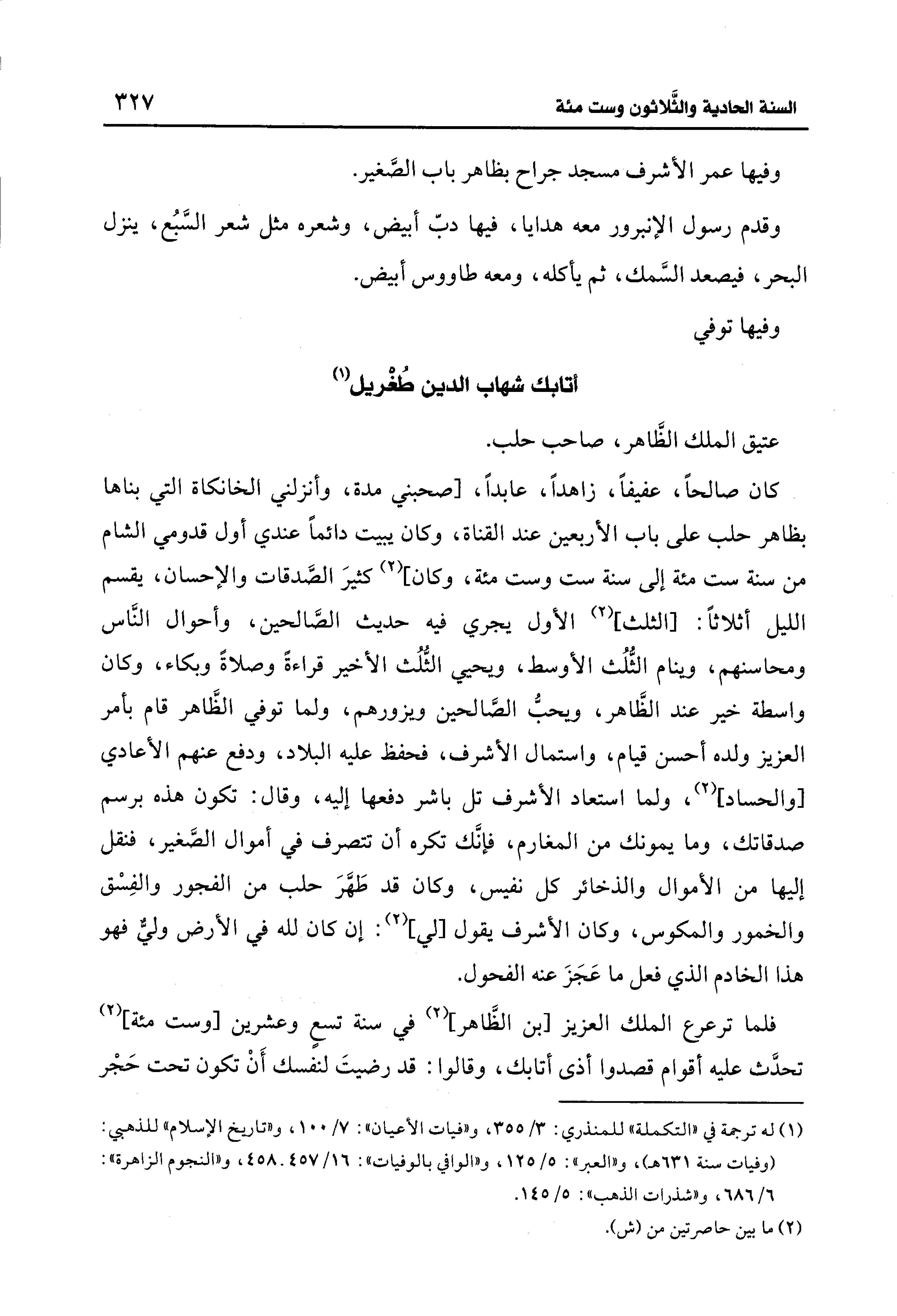 كان صالحًا، عفيفًا، زاهدًا، عابدًا، [صحبني مدة، وأنزلني الخانكاة التي بناها بظاهر حلب على باب الأربعين عند القناة، وكان يبيت دائمًا عندي أول قدومي الشام من سنة ست مئة إلى سنة ست وست مئة، وكان] (¬2) كثيرَ الصَّدقات والإحسان، يقسم الليل أثلاثًا: [الثلث] (2) الأول يجري فيه حديث الصَّالحين، وأحوال النَّاس ومحاسنهم، وينام الثُّلُث الأوسط، ويحيي الثُّلُث الأخير قراءةً وصلاةً وبكاء، وكان واسطة خير عند الظَّاهر، ويحبُّ الصَّالحين ويزورهم، ولما توفي الظَّاهر قام بأمر العزيز ولده أحسن قيام، واستمال الأشرف، فحفظ عليه البلاد، ودفع عنهم الأعادي [والحساد] (2)، ولما استعاد الأشرف تل باشر دفعها إليه، وقال: تكون هذه برسم صدقاتك، وما يمونك من المغارم، فإنَّك تكره أن تتصرف في أموال الصَّغير، فنقل إليها من الأموال والذخائر كل نفيس، وكان قد طَهَّرَ حلب من الفجور والفِسْق والخمور والمكوس، وكان الأشرف يقول [لي] (2): إن كان لله في الأرض وليٌّ فهو هذا الخادم الذي فعل ما عَجَزَ عنه الفحول.
