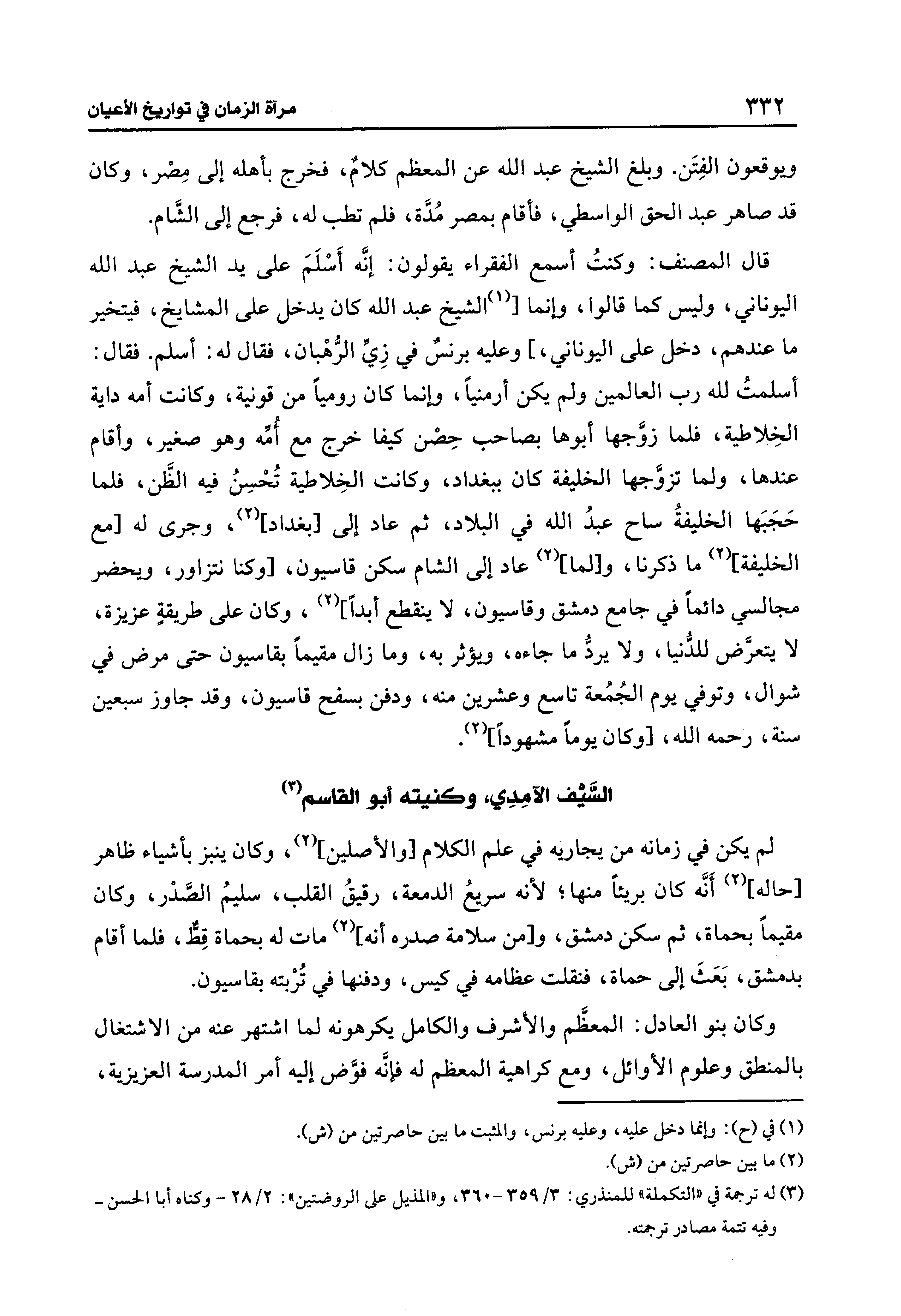 قال المصنف: وكنتُ أسمع الفقراء يقولون: إنَّه أَسْلَمَ على يد الشيخ عبد الله اليوناني، وليس كما قالوا، وإنما [(¬1) الشيخ عبد الله كان يدخل على المشايخ، فيتخير ما عندهم، دخل على اليوناني، ] وعليه برنسٌ في زِيِّ الرُّهْبان، فقال له: أسلم. فقال: أسلمتُ لله رب العالمين ولم يكن أرمنيًّا، وإنما كان روميًّا من قونية، وكانت أمه داية الخِلاطية، فلما زوَّجها أبوها بصاحب حِصْن كيفا خرج مع أُمِّه وهو صغير، وأقام عندها، ولما تزوَّجها الخليفة كان ببغداد، وكانت الخِلاطية تُحْسِنُ فيه الظَّن، فلما حَجَبَها الخليفةُ ساح عبدُ الله في البلاد، ثم عاد إلى [بغداد] (2)، وجرى له [مع الخليفة] (2) ما ذكرنا، و [لما] (2) عاد إلى الشام سكن قاسيون، [وكنا نتزاور، ويحضر مجالسي دائمًا في جامع دمشق وقاسيون، لا ينقطع أبدًا] (2)، وكان على طريقةٍ عزيزة، لا يتعرَّض للدُّنيا، ولا يردُّ ما جاءه، ويؤثر به، وما زال مقيمًا بقاسيون حتى مرض في شوال، وتوفي يوم الجُمُعة تاسع وعشرين منه، ودفن بسفح قاسيون، وقد جاوز سبعين سنة، رحمه الله، [وكان يومًا مشهودًا] (¬2).