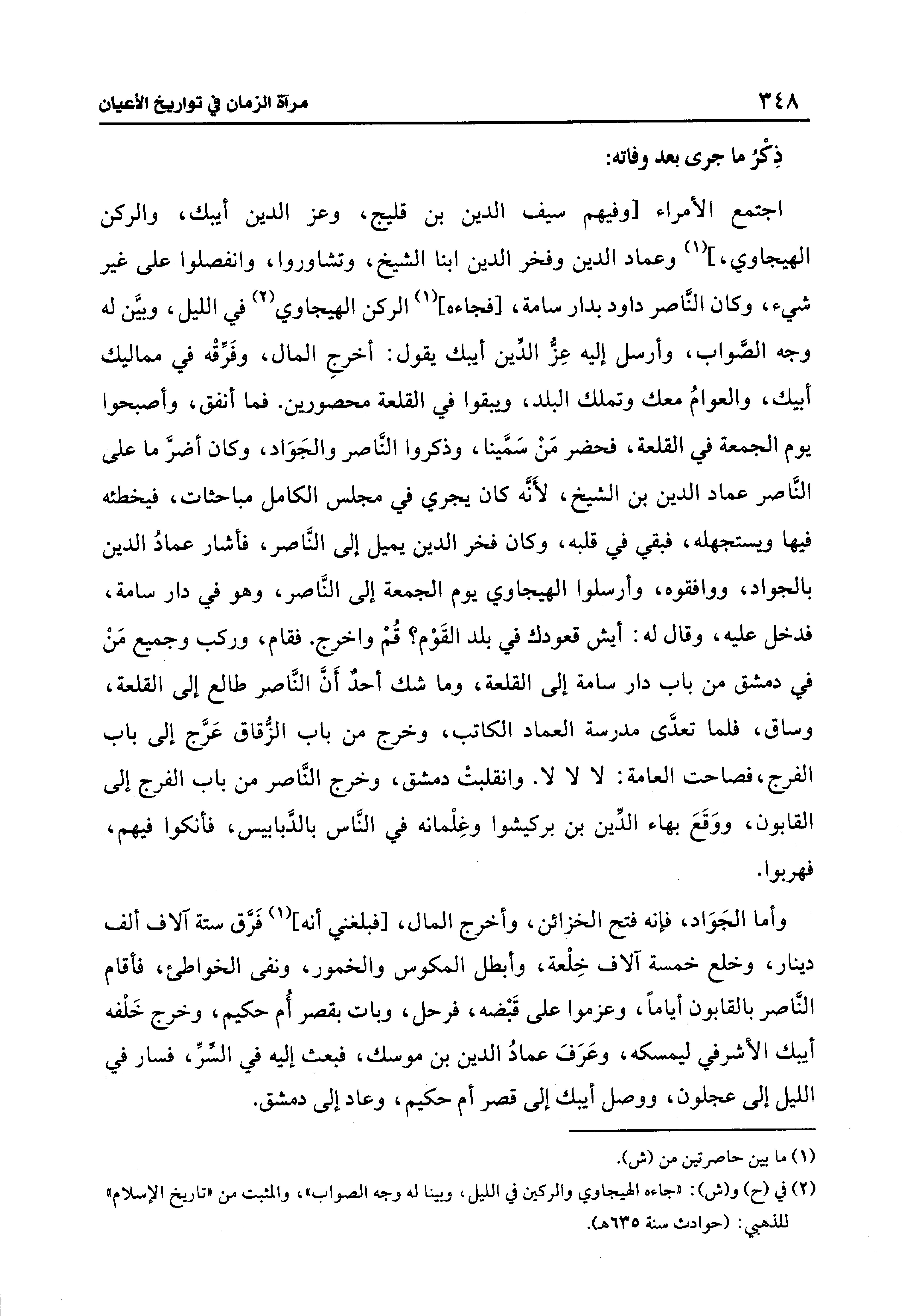 اجتمع الأمراء [وفيهم سيف الدين بن قليج، وعز الدين أيبك، والركن الهيجاوي، ] (1) وعماد الدين وفخر الدين ابنا الشيخ، وتشاوروا، وانفصلوا على غير شيء، وكان النَّاصر داود بدار سامة، [فجاءه] (¬1) الركن الهيجاوي (¬2) فِي الليل، وبيَّن له وجه الصَّواب، وأرسل إليه عِزُّ الدِّين أيبك يقول: أخرجِ المال، وفَرِّقْه فِي مماليك أبيك، والعوامُ معك وتملك البلد، ويبقوا فِي القلعة محصورين. فما أنفق، وأصبحوا يوم الجمعة فِي القلعة، فحضر مَنْ سَمَّينا، وذكروا النَّاصر والجَوَاد، وكان أضرَّ ما على النَّاصر عماد الدين بن الشيخ، لأَنَّه كان يجري فِي مجلس الكامل مباحثات، فيخطئه فيها ويستجهله، فبقي فِي قلبه، وكان فخر الدين يميل إِلَى النَّاصر، فأشار عمادُ الدين بالجواد، ووافقوه، وأرسلوا الهيجاوي يوم الجمعة إِلَى النَّاصر، وهو فِي دار سامة، فدخل عليه، وقال له: أيش قعودك فِي بلد القَوْم؟ قُمْ وأخرج. فقام، وركب وجميع مَنْ فِي دمشق من باب دار سامة إِلَى القلعة، وما شك أحدٌ أَنَّ النَّاصر طالع إِلَى القلعة، وساق، فلما تعدَّى مدرسة العماد الكاتب، وخرج من باب الزُّقاق عَرَّج إِلَى باب الفرج، فصاحت العامة: لا لا لا. وانقلبتْ دمشق، وخرج النَّاصر من باب الفرج إِلَى القابون، ووَقَعَ بهاء الدِّين بن بركيشوا وغِلْمانه فِي النَّاس بالدَّبابيس، فأنكوا فيهم، فهربوا.