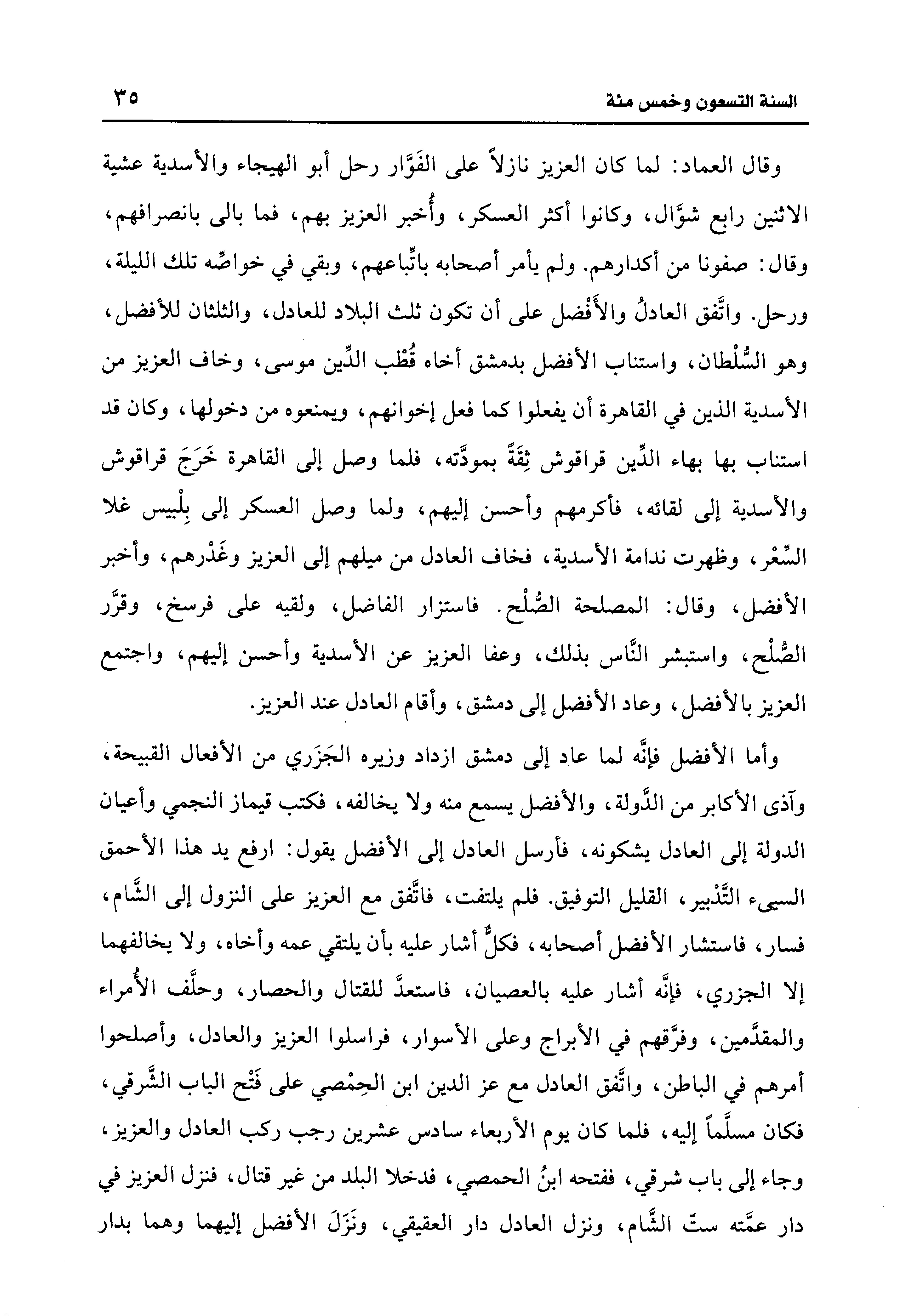 وقال العماد: لما كان العزيز نازلًا على الفَوَّار رحل أبو الهيجاء والأسدية عشية الاثنين رابع شوَّال، وكانوا أكثر العسكر، وأُخبر العزيز بهم، فما بالى بانصرافهم، وقال: صفونا من أكدارهم. ولم يأمر أصحابه باتِّباعهم، وبقي في خواصِّه تلك الليلة، ورحل. واتَّفق العادلُ والأَفْضل على أن تكون ثلث البلاد للعادل، والثلثان للأفضل، وهو السُّلْطان، واستناب الأفضل بدمشق أخاه قُطْب الدِّين موسى، وخاف العزيز من الأسدية الذين في القاهرة أن يفعلوا كما فعل إخوانهم، ويمنعوه من دخولها، وكان قد استناب بها بهاء الدِّين قراقوش ثِقَةً بمودَّته، فلما وصل إلى القاهرة خَرَجَ قراقوش والأسدية إلى لقائه، فأكرمهم وأحسن إليهم، ولما وصل العسكر إلى بِلْبيس غلا السِّعْر، وظهرت ندامة الأسدية، فخاف العادل من ميلهم إلى العزيز وغَدْرهم، وأخبر الأفضل، وقال: المصلحة الصُّلْح. فاستزار الفاضل، ولقيه على فرسخ، وقرَّر الصُّلْح، واستبشر النَّاس بذلك، وعفا العزيز عن الأسدية وأحسن إليهم، واجتمع العزيز بالأفضل، وعاد الأفضل إلى دمشق، وأقام العادل عند العزيز.