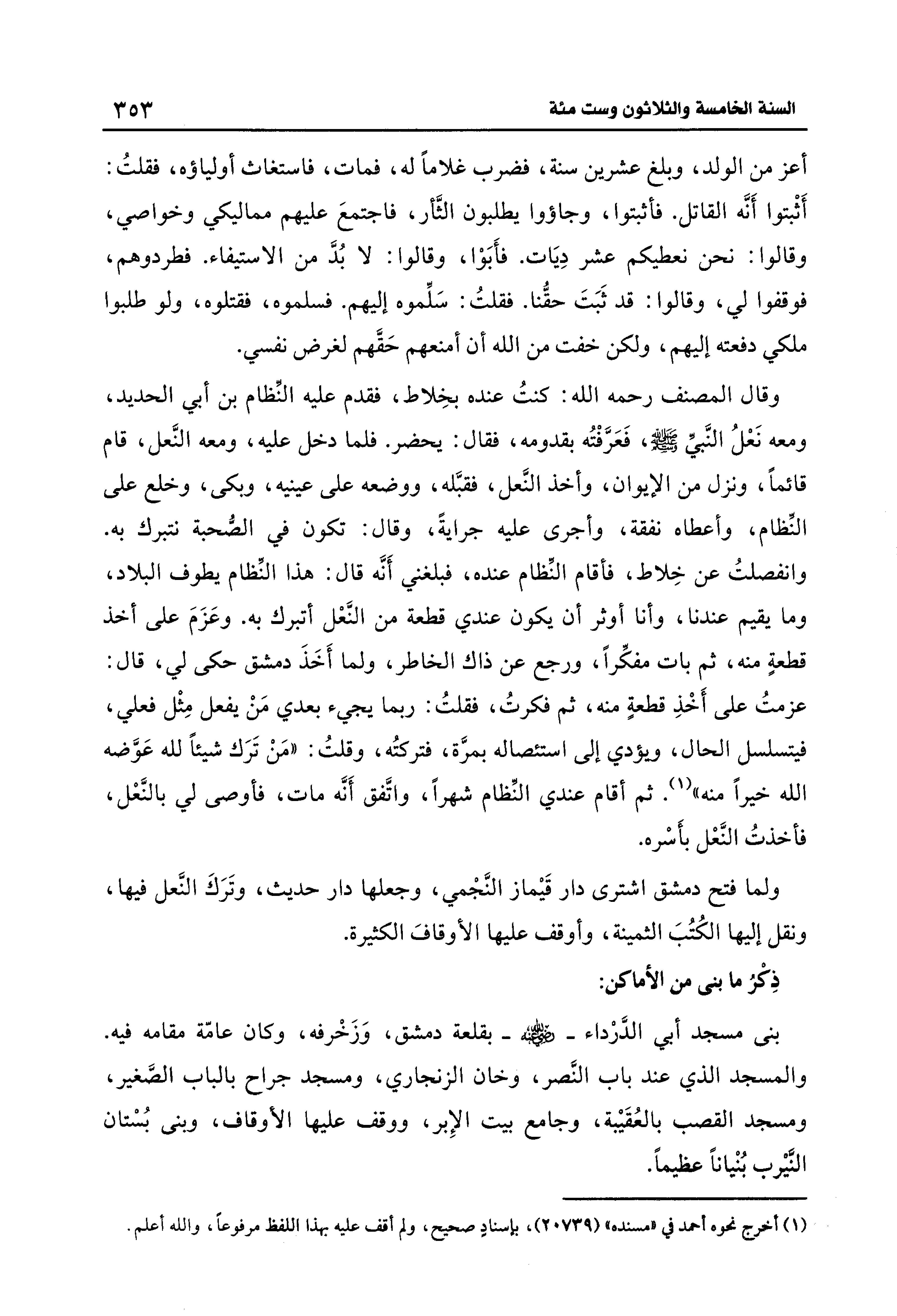 وقال المصنف رحمه الله: كنتُ عنده بخِلاط، فقدم عليه النِّظام بن أبي الحديد، ومعه نَعْلُ النَّبيِّ - صلى الله عليه وسلم -، فَعَرَّفْتُه بقدومه، فقال: يحضر. فلما دخل عليه، ومعه النَّعل، قام قائمًا، ونزل من الإيوان، وأخذ النَّعل، فقبَّله، ووضعه على عينيه، وبكى، وخلع على النِّظام، وأعطاه نفقة، وأجرى عليه جرايةً، وقال: تكون فِي الصُّحبة نتبرك به. وانفصلتُ عن خِلاط، فأقام النِّظام عنده، فبلغني أَنَّه قال: هذا النِّظام يطوف البلاد، وما يقيم عندنا، وأنا أوثر أن يكون عندي قطعة من النَّعْل أتبرك به. وعَزَمَ على أخذ قطعةٍ منه، ثم بات مفكِّرًا، ورجع عن ذاك الخاطر، ولما أَخَذَ دمشق حكى لي، قال: عزمتُ على أَخْذِ قطعةٍ منه، ثم فكرتُ، فقلتُ: ربما يجيء بعدي مَنْ يفعل مِثْل فعلي، فيتسلسل الحال، ويؤدي إِلَى استئصاله بمرَّة، فتركتُه، وقلتُ: "مَنْ تَرَك شيئًا لله عَوَّضه الله خيرًا منه" (¬1). ثم أقام عندي النِّظام شهرًا، واتَّفق أَنَّه مات، فأوصى لي بالنَّعْل، فأخذتُ النَّعْل بأَسْره.