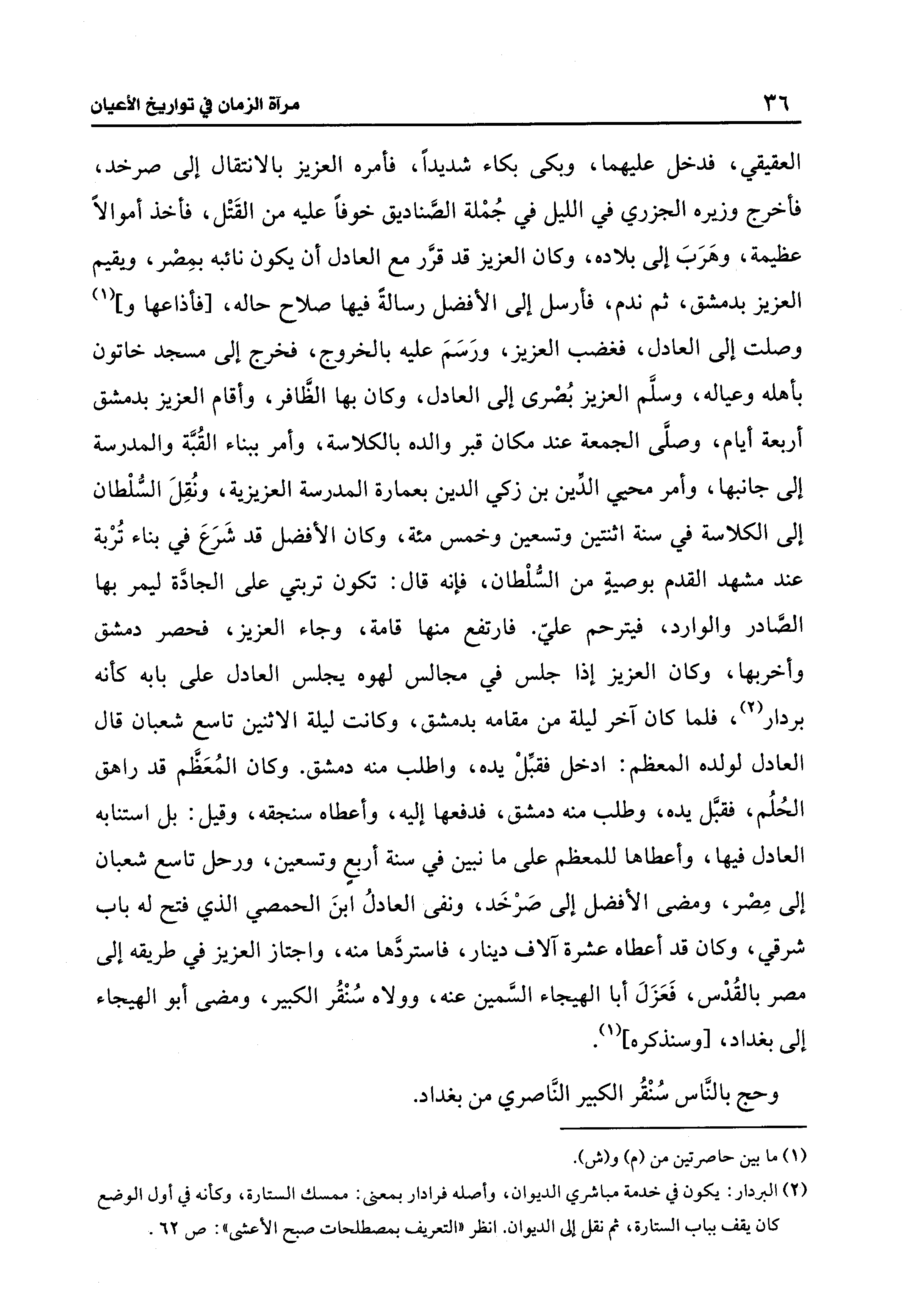 العقيقي، فدخل عليهما، وبكى بكاء شديدًا، فأمره العزيز بالانتقال إلى صرخد، فأخرج وزيره الجزري في الليل في جُمْلة الصَّناديق خوفًا عليه من القَتْل، فأخذ أموالًا عظيمة، وهَرَبَ إلى بلاده، وكان العزيز قد قرَّر مع العادل أن يكون نائبه بمِصْر، ويقيم الحزيز بدمشق، ثم ندم، فأرسل إلى الأفضل رسالة فيها صلاح حاله، [فأذاعها و] (¬1) وصلت إلى العادل، فغضب العزيز، ورَسَمَ عليه بالخروج، فخرج إلى مسجد خاتون بأهله وعياله، وسلَّم العزيز بُصْرى إلى العادل، وكان بها الظَّافر، وأقام العزيز بدمشق أربعة أيام، وصلَّى الجمعة عند مكان قبر والده بالكلاسة، وأمر ببناء القُبَّة والمدرسة إلى جانبها، وأمر محيي الدِّين بن زكي الدين بعمارة المدرسة العزيزية، ونُقِلَ السُّلْطان إلى الكلاسة في سنة اثنتين وتسعين وخمس مئة، وكان الأفضل قد شَرَعَ في بناء تُرْبة عند مشهد القدم بوصيةٍ من السُّلْطان، فإنه قال: تكون تربتي على الجادَّة ليمر بها الصَّادر والوارد، فيترحم عليّ. فارتفع منها قامة، وجاء العزيز، فحصر دمشق وأخربها، وكان العزيز إذا جلس في مجالس لهوه يجلس العادل على بابه كأنه بردار (¬2)، فلما كان آخر ليلة من مقامه بدمشق، وكانت ليلة الاثنين تاسع شعبان قال العادل لولده المعظم: ادخل فقبِّلْ يده، واطلب منه دمشق. وكان المُعَظَّم قد راهق الحُلُم، فقبَّل يده، وطلب منه دمشق، فدفعها إليه، وأعطاه سنجقه، وقيل: بل استنابه العادل فيها، وأعطاها للمعظم على ما نبين في سنة أربع وتسعين، ورحل تاسع شعبان إلى مِصْر، ومضى الأفضل إلى صَرْخَد، ونفى العادلُ ابنَ الحمصي الَّذي فتح له باب شرقي، وكان قد أعطاه عشرة آلاف دينار، فاستردَّها منه، واجتاز العزيز في طريقه إلى مصر بالقُدْس، فَعَزَلَ أبا الهيجاء السَّمين عنه، وولاه سُنْقُر الكبير، ومضى أبو الهيجاء إلى بغداد، [وسنذكره] (1).