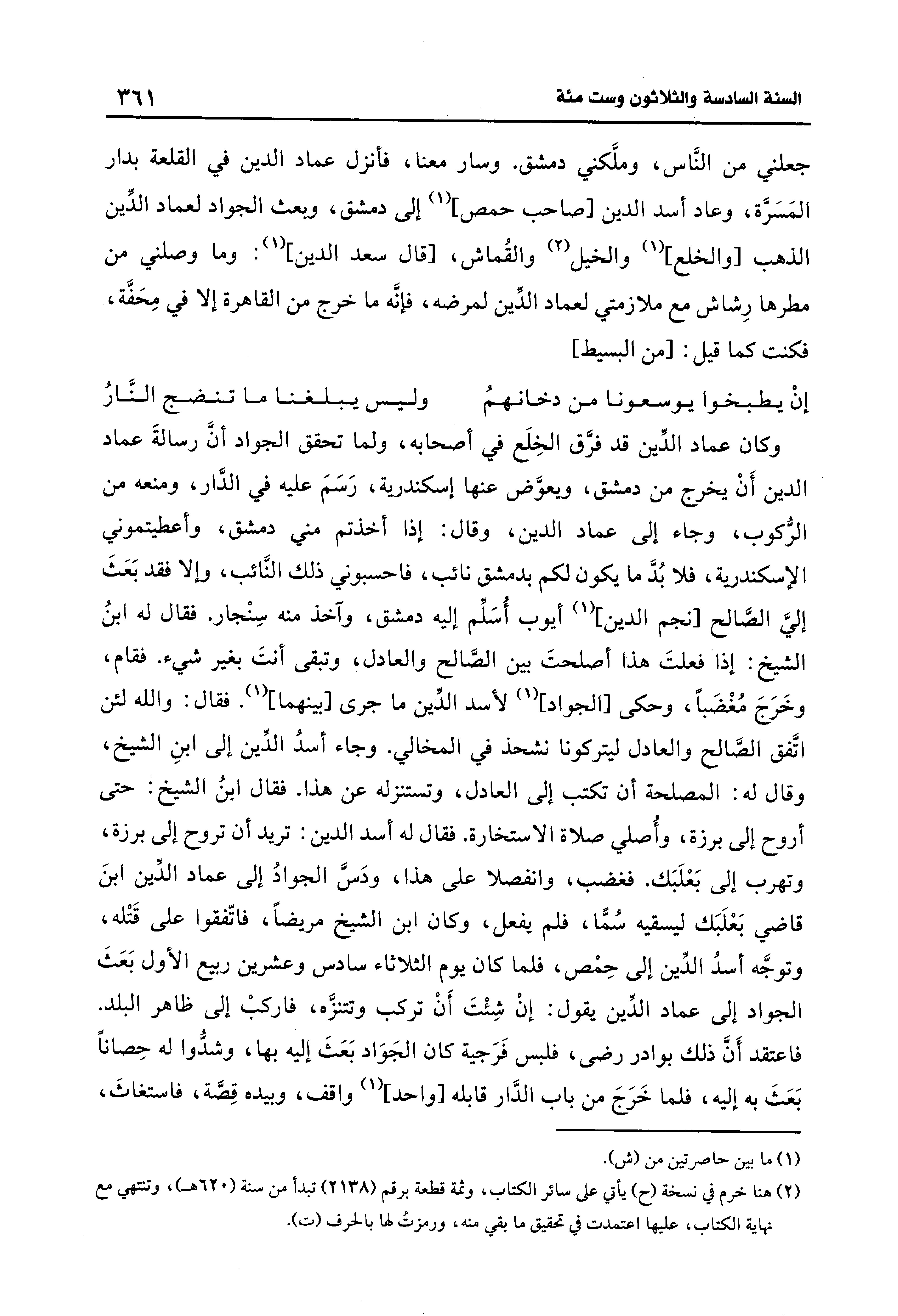جعلني من النَّاس، وملَّكني دمشق. وسار معنا، فأنزل عماد الدين فِي القلعة بدار المَسَرَّة، وعاد أسد الدين [صاحب حمص] (¬1) إِلَى دمشق، وبعث الجواد لعماد الدِّين الذهب [والخلع] (1) والخيل (¬2) والقُماش، [قال سعد الدين] (1): وما وصلني من مطرها رِشاش مع ملازمتي لعماد الدِّين لمرضه، فإنَّه ما خرج من القاهرة إلَّا فِي مِحَفَّة، فكنت كما قيل: [من البسيط]