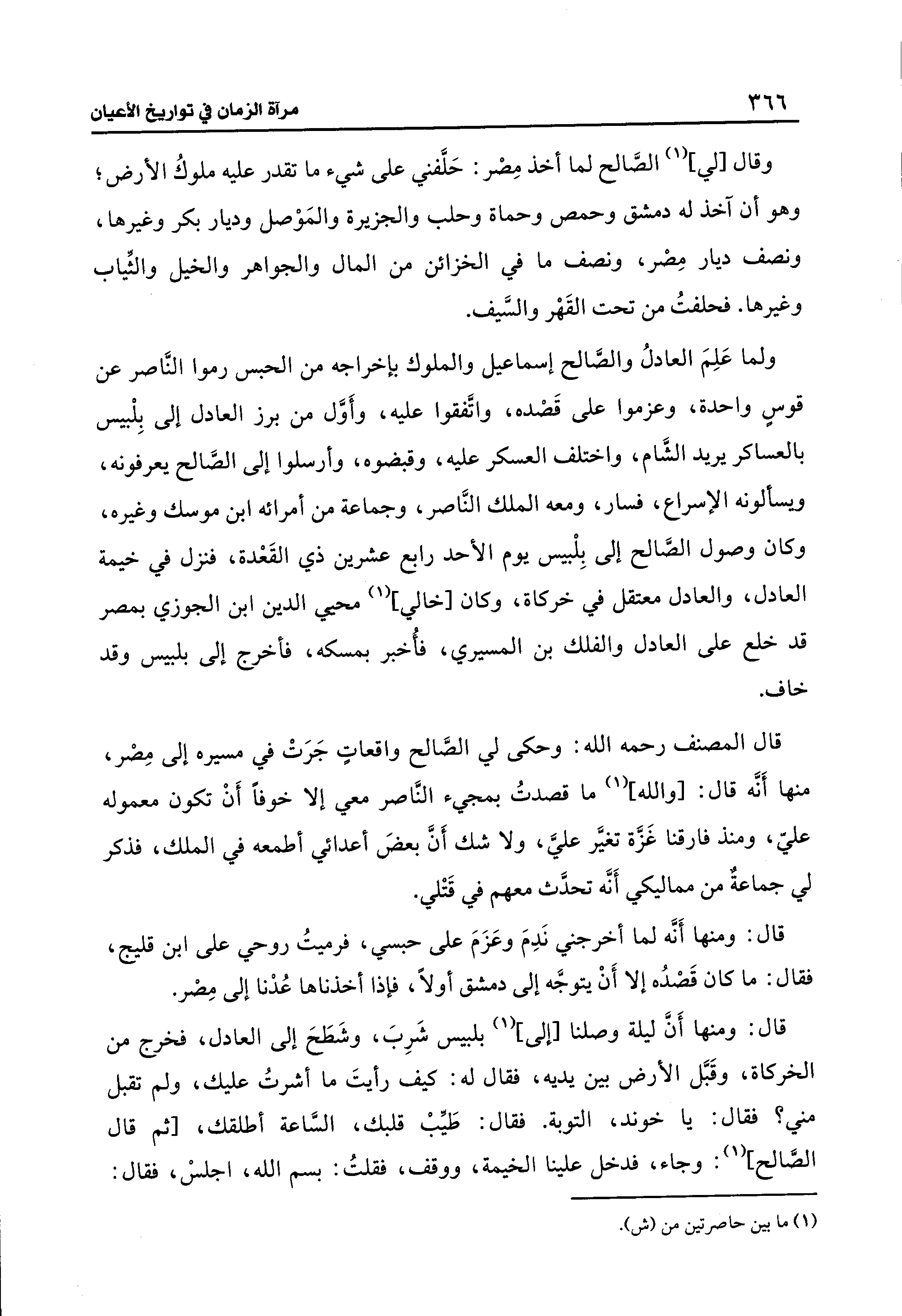قال المصنف رحمه الله: وحكى لي الصَّالح واقعاتٍ جَرَتْ فِي مسيره إِلَى مِصْر، منها أَنَّه قال: [والله] (1) ما قصدتُ بمجيء النَّاصر معي إلَّا خوفًا أَنْ تكون معموله عليّ، ومنذ فارقنا غَزَّة تغيَّر عليَّ، ولا شك أَنَّ بعضَ أعدائي أطمعه فِي الملك، فذكر لي جماعةٌ من مماليكي أَنَّه تحدَّث معهم فِي قَتْلي.