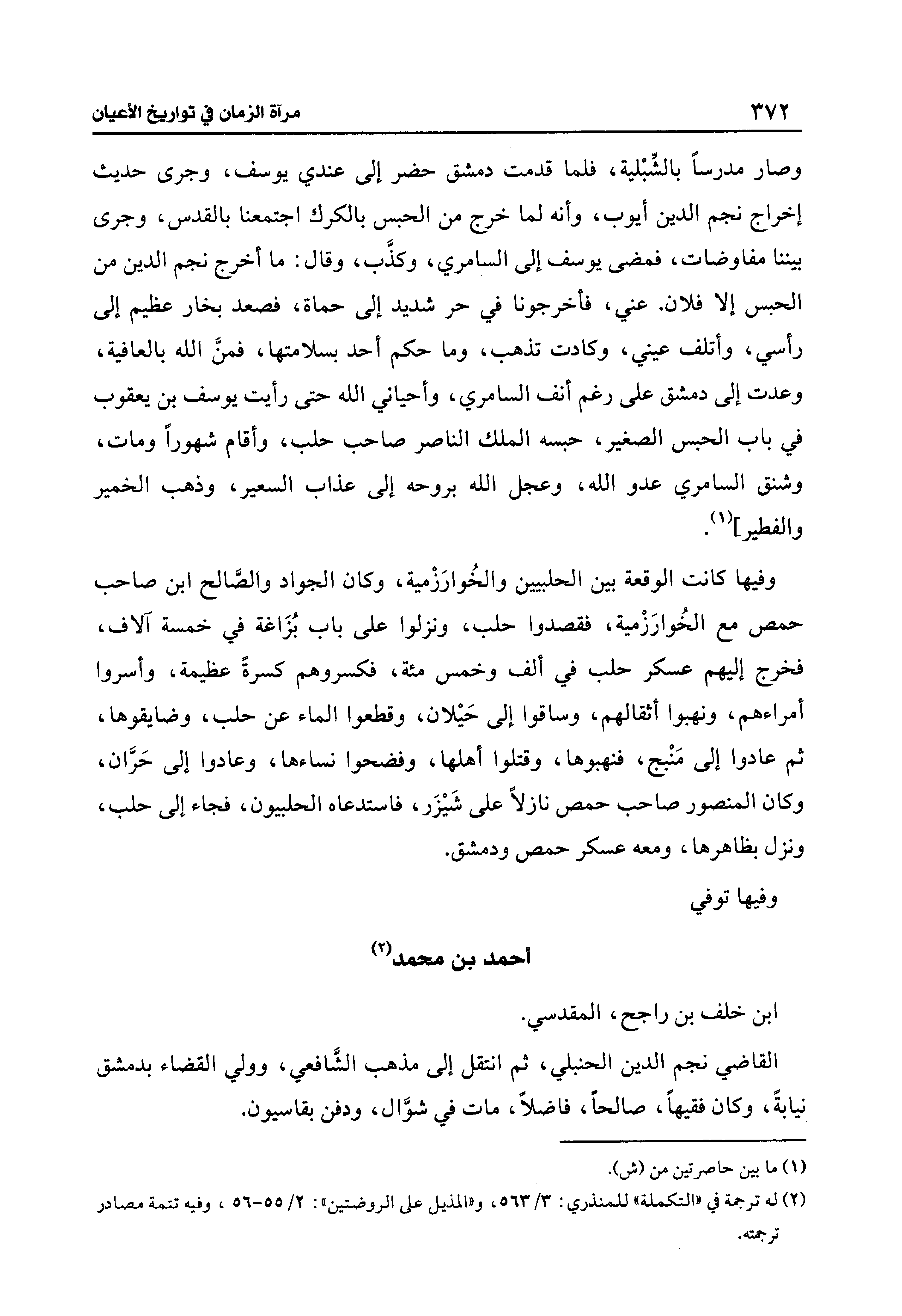 وصار مدرسًا بالشِّبْلية، فلما قدمت دمشق حضر إِلَى عندي يوسف، وجرى حديث إخراج نجم الدين أَيُّوب، وأنه لما خرج من الحبس بالكرك اجتمعنا بالقدس، وجرى بيننا مفاوضات، فمضى يوسف إِلَى السامري، وكذَّب، وقال: ما أخرج نجم الدين من الحبس إلَّا فلان. عني، فأخرجونا فِي حر شديد إِلَى حماة، فصعد بخار عظيم إِلَى رأسي، وأتلف عيني، وكادت تذهب، وما حكم أحد بسلامتها، فمنَّ الله بالعافية، وعدت إِلَى دمشق على رغم أنف السامري، وأحياني الله حتَّى رأيت يوسف بن يعقوب فِي باب الحبس الصغير، حبسه الملك الناصر صاحب حلب، وأقام شهورًا ومات، وشنق السامري عدو الله، وعجل الله بروحه إِلَى عذاب السعير، وذهب الخمير والفطير] (¬1).