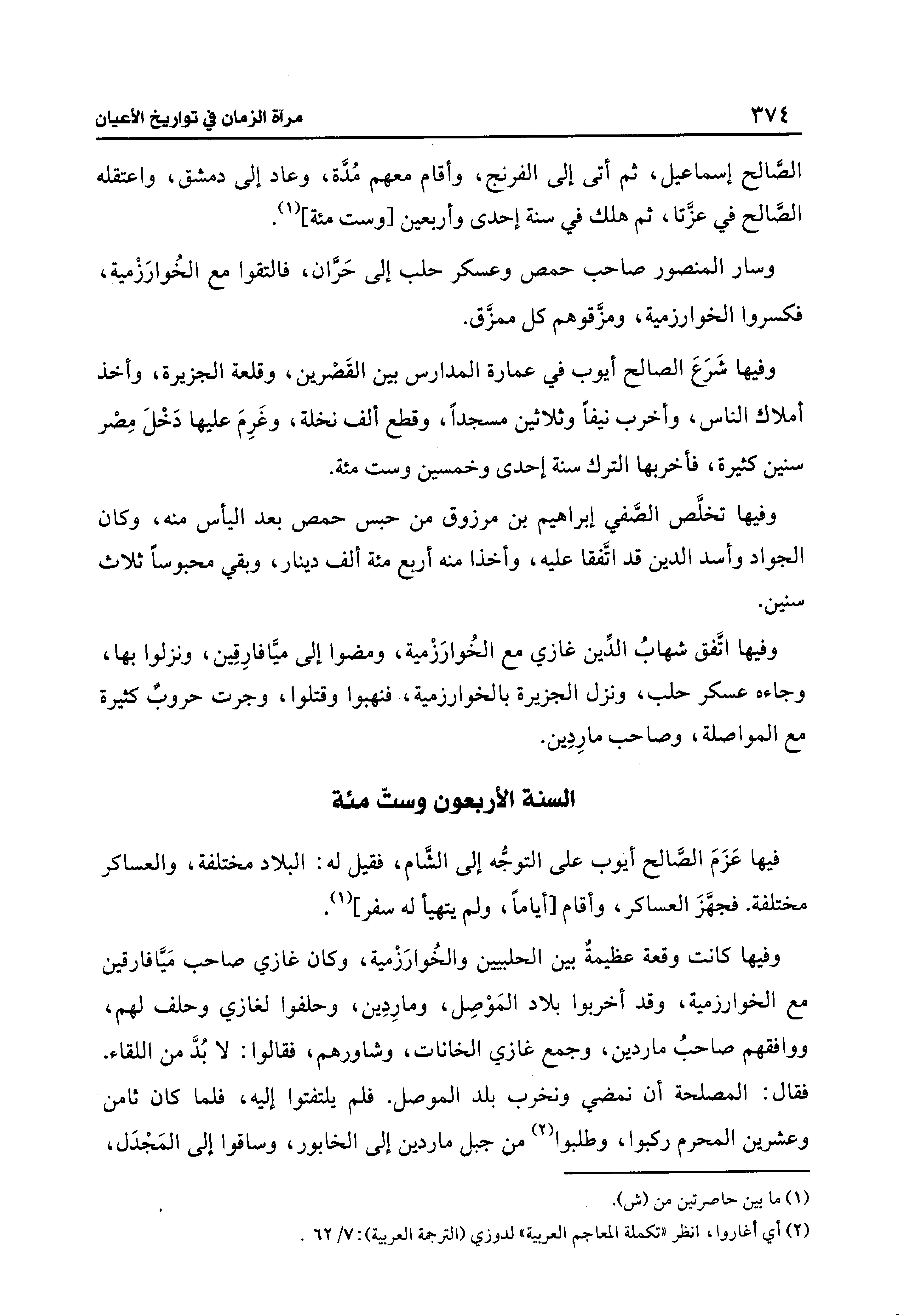وفيها اتَّفق شهابُ الدِّين غازي مع الخُوارَزْمية، ومضوا إِلَى ميَّافارِقِين، ونزلوا بها، وجاءه عسكر حلب، ونزل الجزيرة بالخوارزمية، فنهبوا وقتلوا، وجرت حروبٌ كثيرة مع المواصلة، وصاحب مارِدِين.