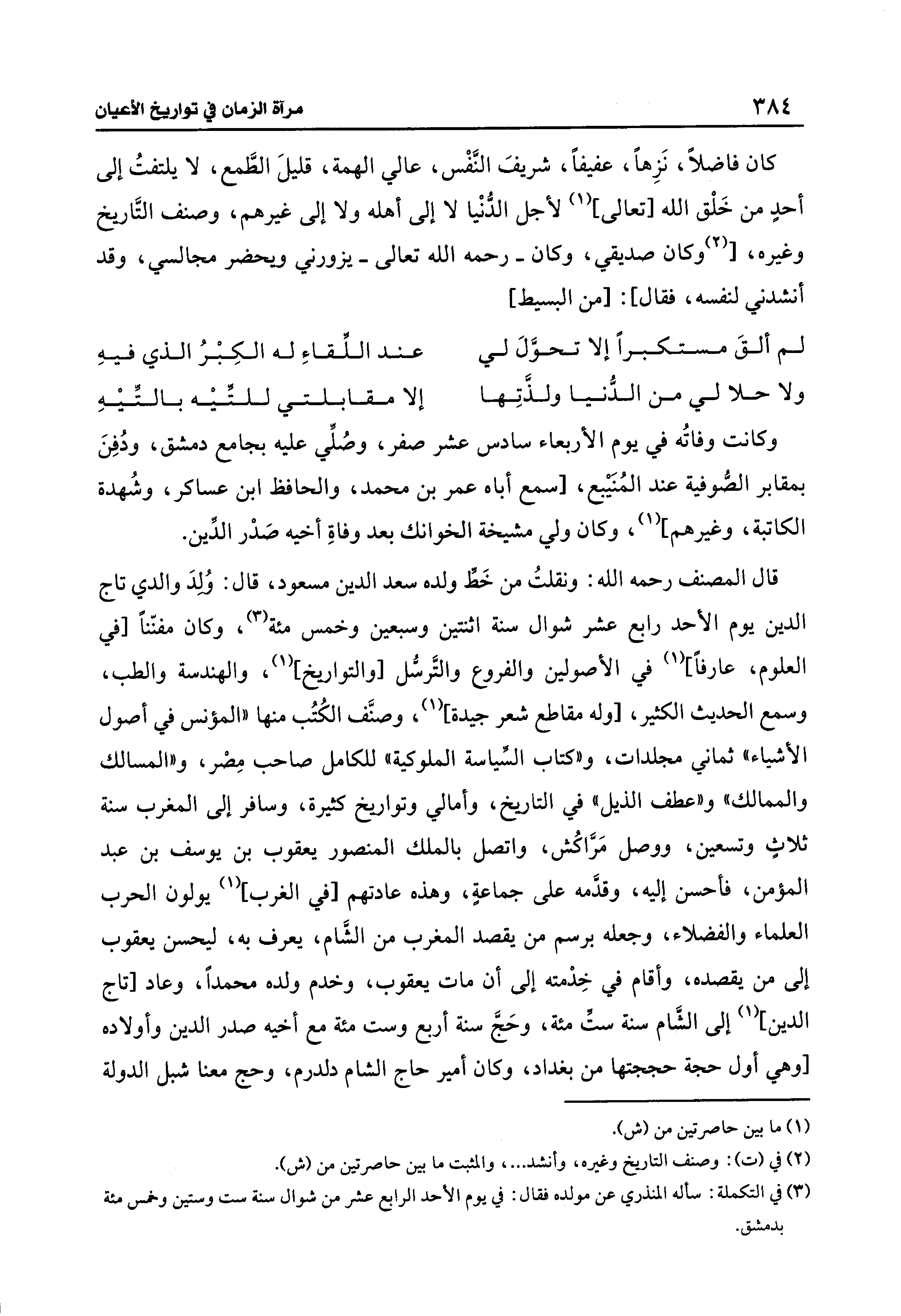 كان فاضلًا، نَزِهًا، عفيفًا، شريفَ النَّفْس، عالي الهمة، قليلَ الطَّمع، لا يلتفتُ إِلَى أحدٍ من خَلْق الله [تعالى] (¬1) لأجل الدُّنْيا لا إِلَى أهله ولا إِلَى غيرهم، وصنف التَّاريخ وغيره، [(¬2) وكان صديقي، وكان -رحمه الله تعالى- يزورني ويحضر مجالسي، وقد أنشدني لنفسه، فقال]: [من البسيط]