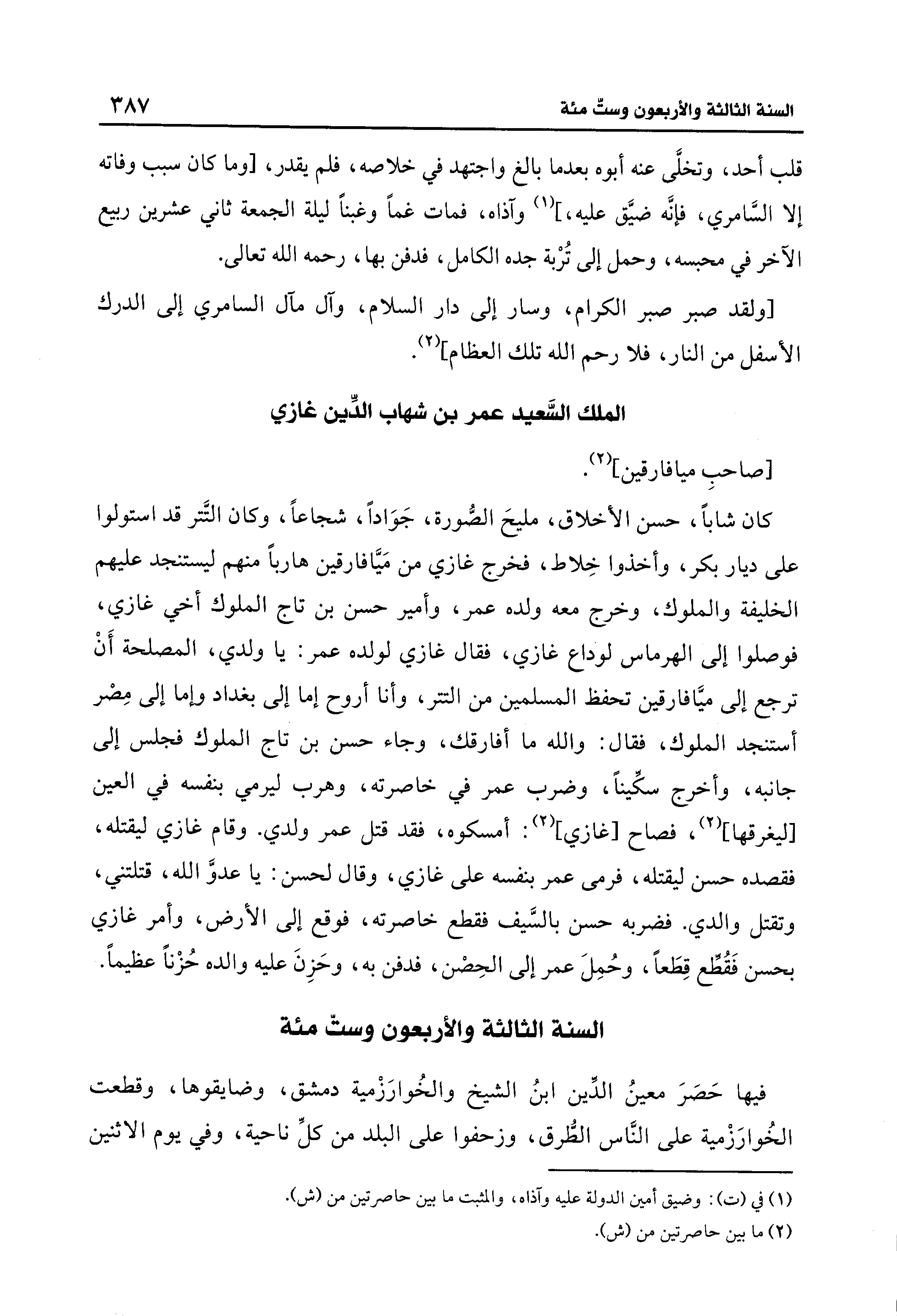 كان شابًّا، حسن الأخلاق، مليحَ الصُّورة، جَوَادًا، شجاعًا، وكان التَّتر قد استولوا على ديار بكر، وأخذوا خِلاط، فخرج غازي من مَيَّافارقين هاربًا منهم ليستنجد عليهم الخليفة والملوك، وخرج معه ولده عمر، وأمير حسن بن تاج الملوك أخي غازي، فوصلوا إِلَى الهرماس لوداع غازي، فقال غازي لولده عمر: يَا ولدي، المصلحة أَنْ ترجع إِلَى ميَّافارقين تحفظ المسلمين من التتر، وأنا أروح إما إِلَى بغداد وإما إِلَى مِصْر أستنجد الملوك، فقال: والله ما أفارقك، وجاء حسن بن تاج الملوك فجلس إِلَى جانبه، وأخرج سكِّينًا، وضرب عمر فِي خاصرته، وهرب ليرمي بنفسه فِي العين [ليغرقها] (2)، فصاح [غازي] (2): أمسكوه، فقد قتل عمر ولدي. وقام غازي ليقتله، فقصده حسن ليقتله، فرمى عمر بنفسه على غازي، وقال لحسن: يَا عدوَّ الله، قتلتني، وتقتل والدي. فضربه حسن بالسَّيف فقطع خاصرته، فوقع إِلَى الأرض، وأمر غازي بحسن فَقُطِّع قِطَعًا، وحُمِلَ عمر إِلَى الحِصْن، فدفن به، وحَزِنَ عليه والده حُزْنًا عظيمًا.
