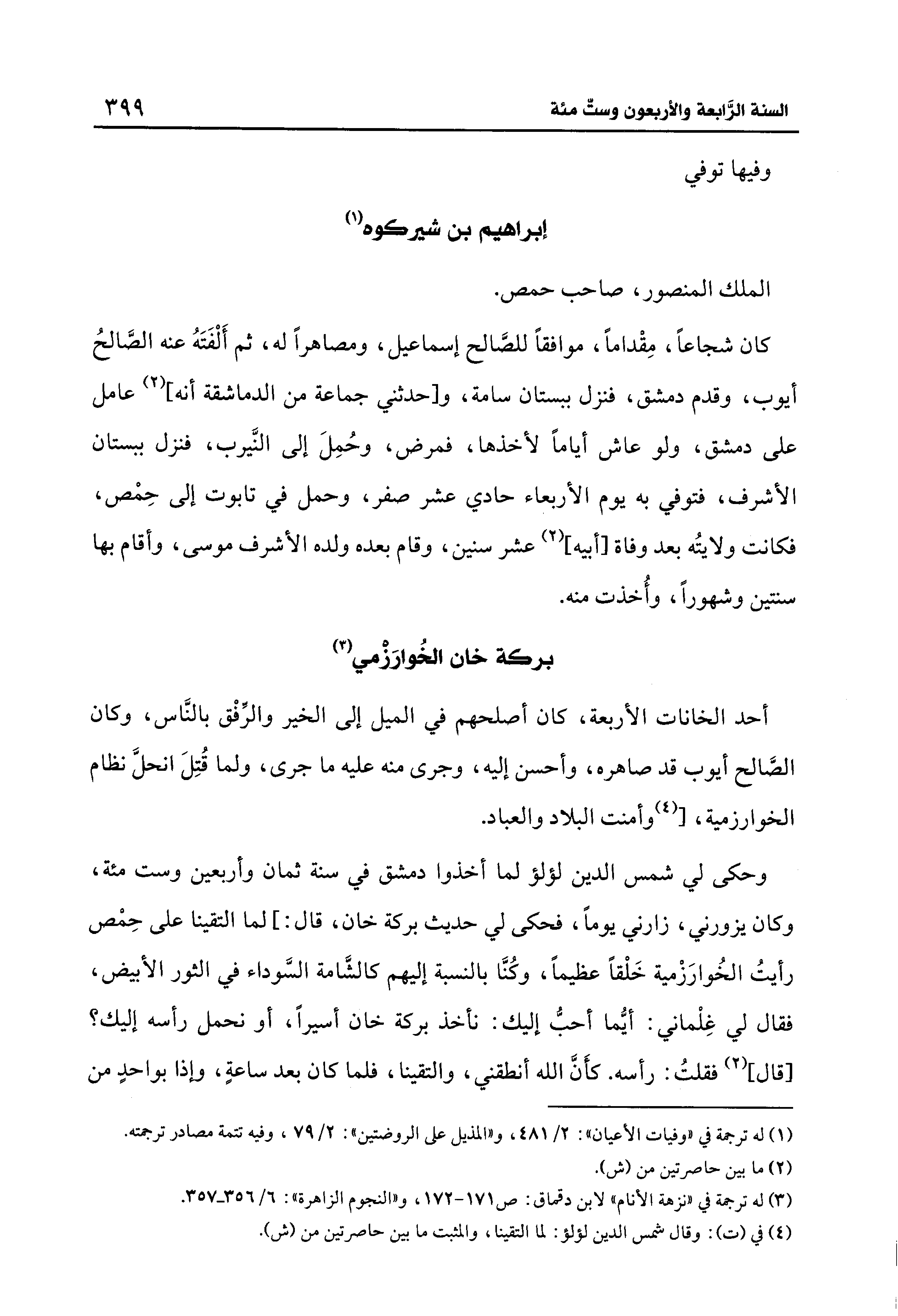 وحكى لي شمس الدين لؤلؤ لما أخذوا دمشق في سنة ثمان وأربعين وست مئة، وكان يزورني، زارني يومًا، فحكى لي حديث بركة خان، قال: ] لما التقينا على حِمْص رأيتُ الخُوارَزْمية خَلْقًا عظيمًا، وكُنَّا بالنسبة إليهم كالشَّامة السَّوداء في الثور الأبيض، فقال لي غِلْماني: أيُّما أحبُّ إليك: نأخذ بركة خان أسيرًا، أو نحمل رأسه إليك؟ [قال] (2) فقلتُ: رأسه. كأَنَّ الله أنطقني، والتقينا، فلما كان بعد ساعةٍ، وإذا بواحدٍ من
