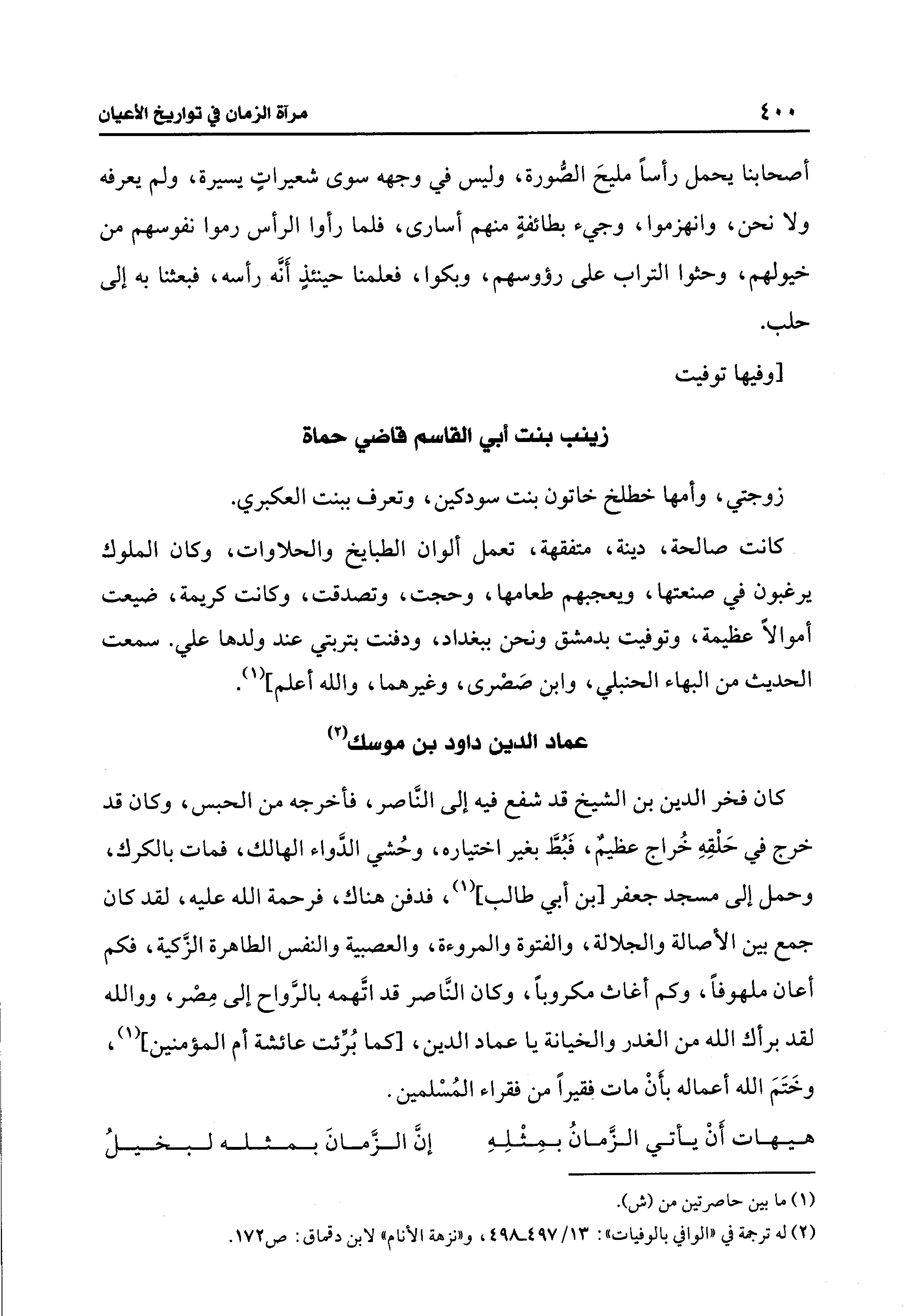 كان فخر الدين بن الشيخ قد شفع فيه إلى النَّاصر، فأخرجه من الحبس، وكان قد خرج في حَلْقِهِ خُراج عظيمٌ، فَبُطَّ بغير اختياره، وحُشي الدَّواء الهالك، فمات بالكرك، وحمل إلى مسجد جعفر [بن أبي طالب] (1)، فدفن هناك، فرحمة الله عليه، لقد كان جمع بين الأصالة والجلالة، والفتوة والمروءة، والعصبية والنفس الطاهرة الزَّكية، فكم أعان ملهوفًا، وكم أغاث مكروبًا، وكان النَّاصر قد اتَّهمه بالرَّواح إلى مِصْر، ووالله لقد برأك الله من الغدر والخيانة يا عماد الدين، [كما بُرِّئت عائشة أم المؤمنين] (1)، وخَتَمَ الله أعماله بأَنْ مات فقيرًا من فقراء المُسْلمين.
