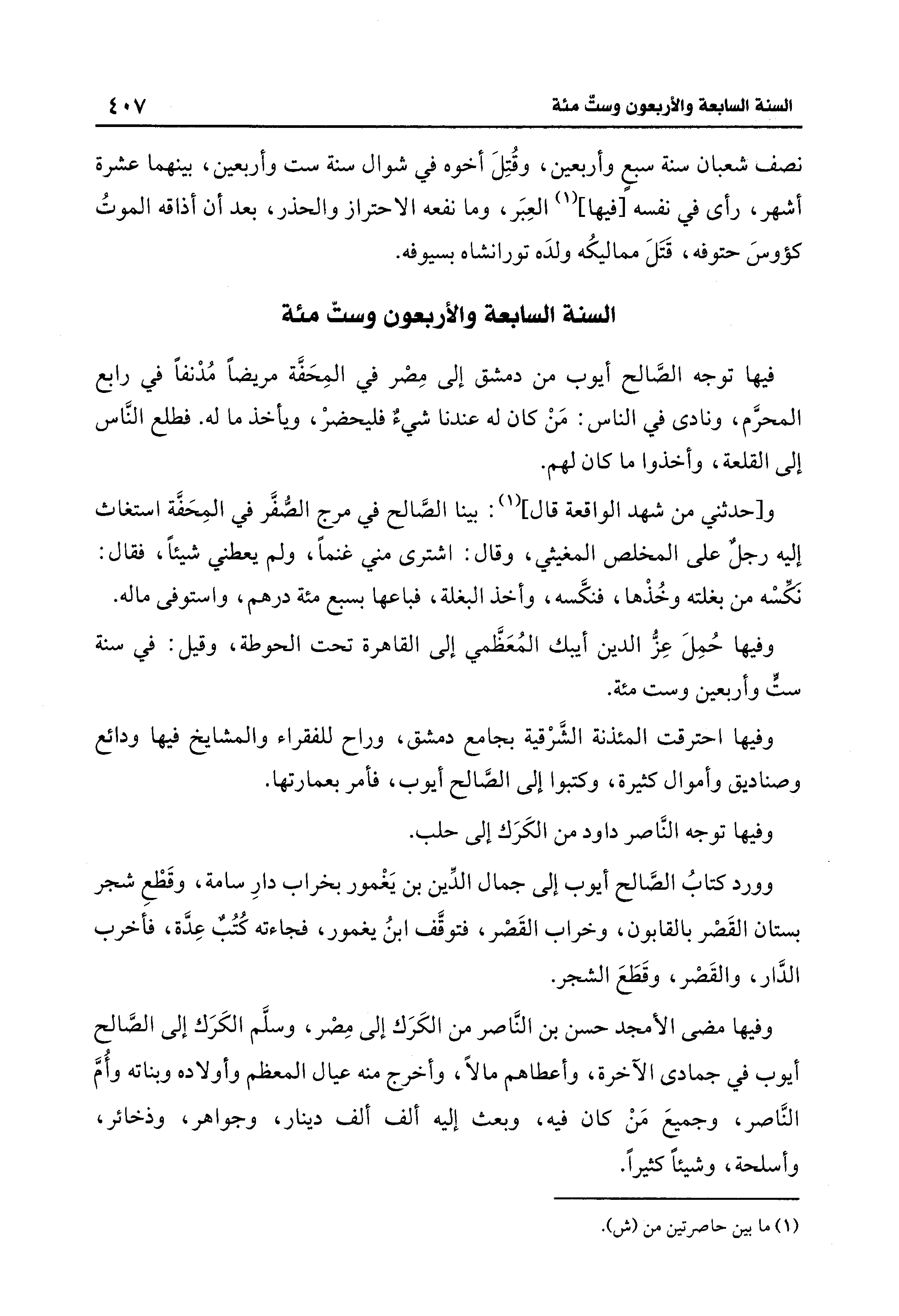 فيها توجه الصَّالح أيوب من دمشق إلى مِصْر في المِحَفَّة مريضًا مُدْنفًا في رابع المحرَّم، ونادى في الناس: مَنْ كان له عندنا شيءٌ فليحضرْ، ويأخذ ما له. فطلع النَّاس إلى القلعة، وأخذوا ما كان لهم.