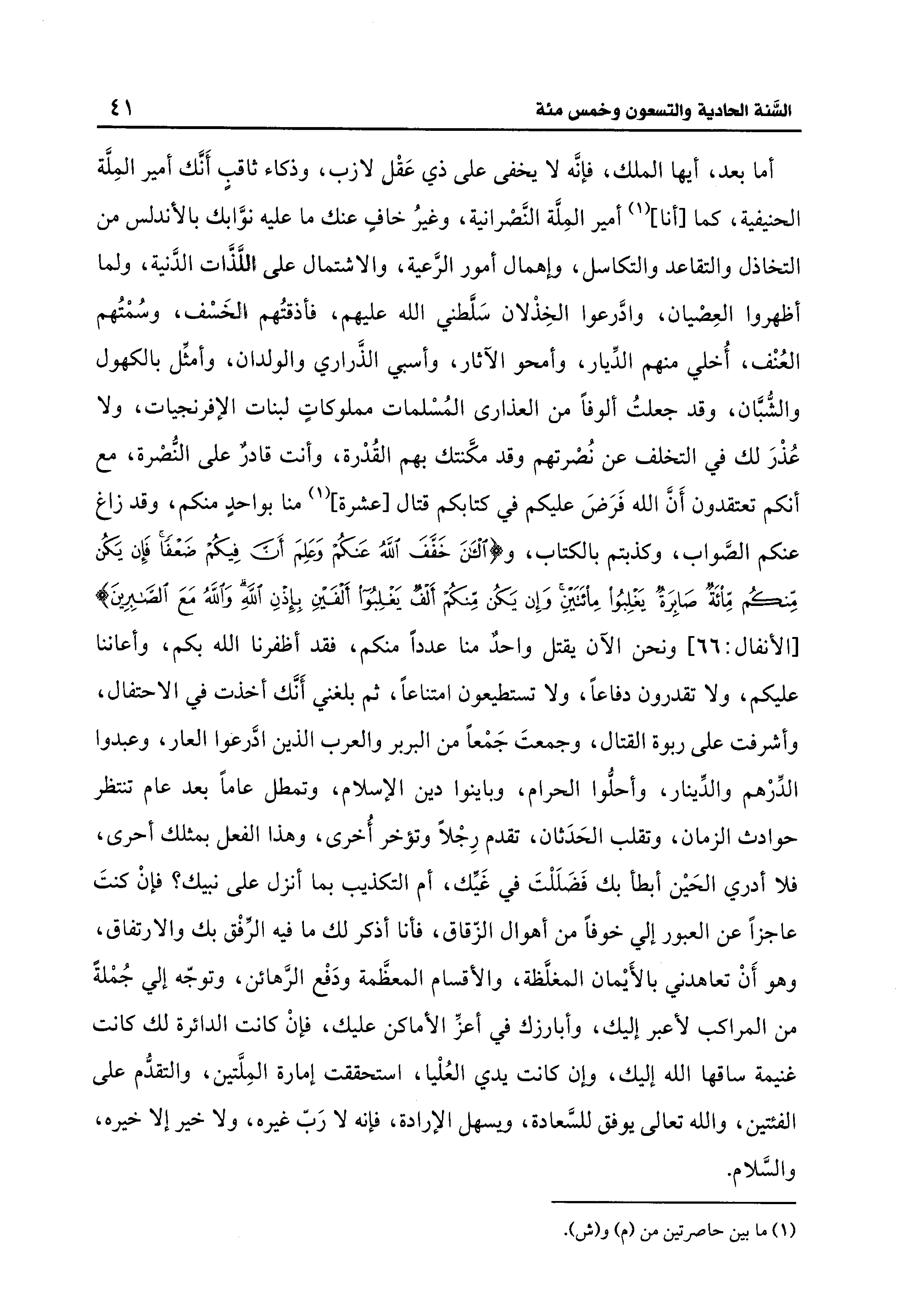 أما بعد، أيها الملك، فإنَّه لا يخفى على ذي عَقْل لازب، وذكاء ثاقب أَنَّك أمير المِلَّة الحنيفية، كما [أنا] (¬1) أمير المِلَّة النَّصْرانية، وغيرُ خافٍ عنك ما عليه نوَّابك بالأندلس من التخاذل والتقاعد والتكاسل، وإهمال أمور الرَّعية، والاشتمال على اللَّذَّات الدَّنية، ولما أظهروا العِصْيان، وادَّرعوا الخِذْلان سَلَّطني الله عليهم، فأذقتُهم الخَسْف، وسُمْتُهم العُنْف، أُخلي منهم الدِّيار، وأمحو الآثار، وأسبي الذَّراري والولدان، وأمثِّل بالكهول والشُّبَّان، وقد جعلتُ ألوفًا من العذارى المُسْلمات مملوكاتٍ لبنات الإفرنجيات، ولا عُذْرَ لك في التخلف عن نُصْرتهم وقد مكَّنتك بهم القُدْرة، وأنت قادرٌ على النُّصْرة، مع أنكم تعتقدون أَنَّ الله فَرَضَ عليكم في كتابكم قتال [عشرة] (1) منا بواحدٍ منكم، وقد زاغ عنكم الصَّواب، وكذبتم بالكتاب، و {الْآنَ خَفَّفَ اللَّهُ عَنْكُمْ وَعَلِمَ أَنَّ فِيكُمْ ضَعْفًا فَإِنْ يَكُنْ مِنْكُمْ مِائَةٌ صَابِرَةٌ يَغْلِبُوا مِائَتَينِ وَإِنْ يَكُنْ مِنْكُمْ أَلْفٌ يَغْلِبُوا أَلْفَينِ بِإِذْنِ اللَّهِ وَاللَّهُ مَعَ الصَّابِرِينَ} [الأنفال: 66] ونحن الآن يقتل واحدٌ منا عددًا منكم، فقد أظفرنا الله بكم، وأعاننا عليكم، ولا تقدرون دفاعًا، ولا تستطيعون امتناعًا، ثم بلغني أَنَّك أخذت في الاحتفال، وأشرفت على ربوة القتال، وجمعتَ جَمْعًا من البربر والعرب الذين ادَّرعوا العار، وعبدوا الدِّرْهم والدِّينار، وأحلُّوا الحرام، وباينوا دين الإسلام، وتمطل عامًا بعد عام تنتظر حوادث الزمان، وتقلب الحَدَثان، تقدم رِجْلًا وتؤخر أُخرى، وهذا الفعل بمثلك أحرى، فلا أدري الحَين أبطأ بك فَضَلَلْتَ في غَيِّك، أم التكذيب بما أنزل على نبيك؟ فإنْ كنتَ عاجزًا عن العبور إلي خوفًا من أهوال الزّقاق، فأنا أذكر لك ما فيه الرِّفْق بك والارتفاق، وهو أَنْ تعاهدني بالأَيمان المغلَّظة، والأقسام المعظَّمة ودَفْع الرَّهائن، وتوجّه إلي جُمْلة من المراكب لأعبر إليك، وأبارزك في أعزِّ الأماكن عليك، فإنْ كانت الدائرة لك كانت غنيمة ساقها الله إليك، وإن كانت يدي العُلْيا، استحققت إمارة المِلَّتين، والتقدُّم على الفئتين، والله تعالى يوفق للسَّعادة، ويسهل الإرادة، فإنه لا رَبّ غيره، ولا خير إلا خيره، والسَّلام.
