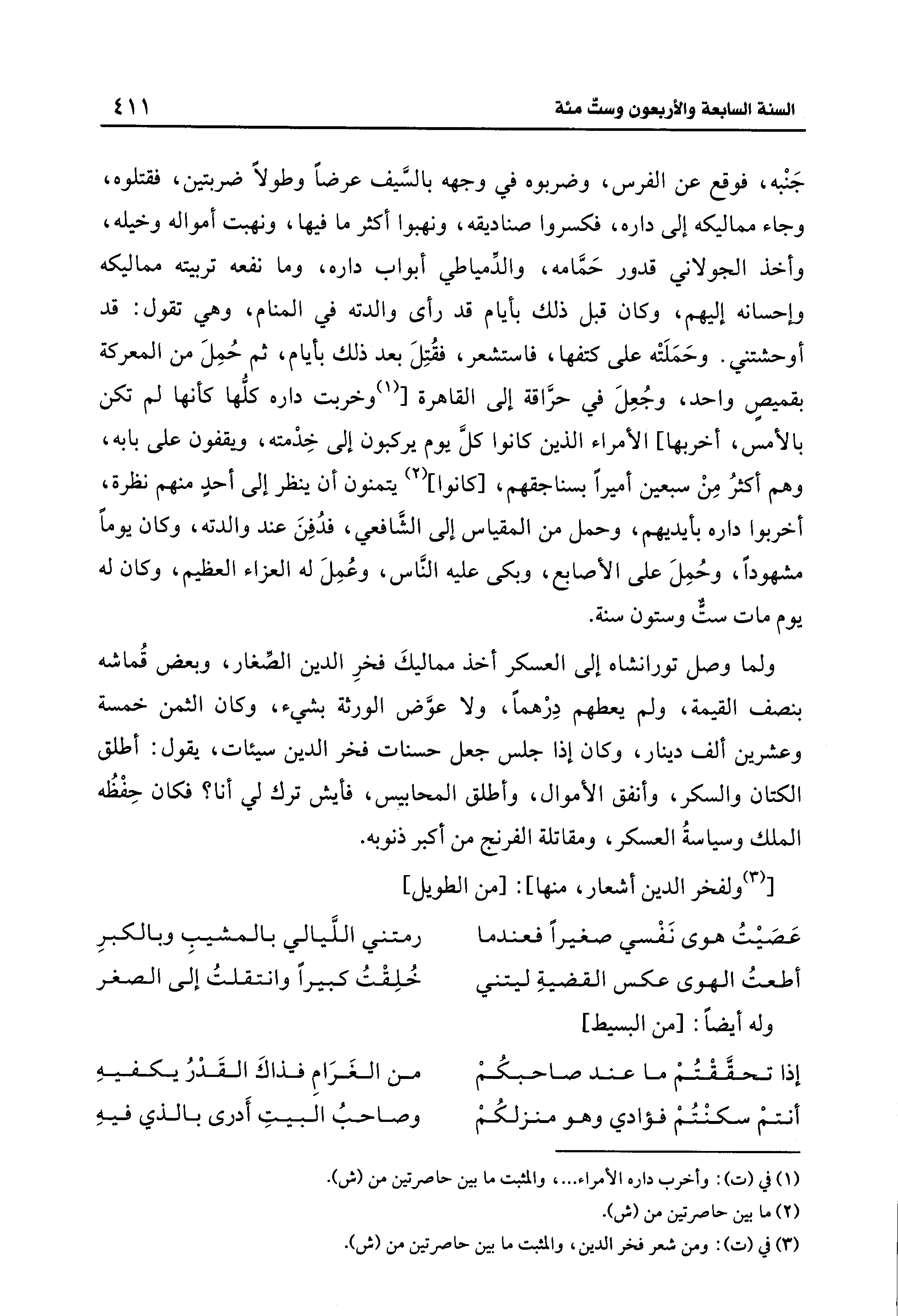 جَنْبه، فوقع عن الفرس، وضربوه في وجهه بالسَّيف عرضًا وطولًا ضربتين، فقتلوه، وجاء مماليكه إلى داره، فكسروا صناديقه، ونهبوا أكثر ما فيها، ونهبت أمواله وخيله، وأخذ الجولاني قدور حَمَّامه، والدِّمياطي أبواب داره، وما نفعه تربيته مماليكه وإحسانه إليهم، وكان قبل ذلك بأيام قد رأى والدته في المنام، وهي تقول: قد أوحشتني. وحَمَلَتْه على كتفها، فاستشعر، فقُتِلَ بعد ذلك بأيام، ثم حُمِلَ من المعركة بقميصٍ واحد، وجُعِلَ في حرَّاقة إلى القاهرة [(¬1) وخربت داره كلُّها كأنها لم تكن بالأمس، أخربها] الأمراء الذين كانوا كلَّ يوم يركبون إلى خِدْمته، ويقفون على بابه، وهم أكثرُ مِنْ سبعين أميرًا بسناجقهم، [كانوا] (¬2) يتمنون أن ينظر إلى أحدٍ منهم نظرة، أخربوا داره بأيديهم، وحمل من المقياس إلى الشَّافعي، فدُفِنَ عند والدته، وكان يومًا مشهودًا، وحُمِلَ على الأصابع، وبكى عليه النَّاس، وعُمِلَ له العزاء العظيم، وكان له يوم مات ستٌّ وستون سنة.