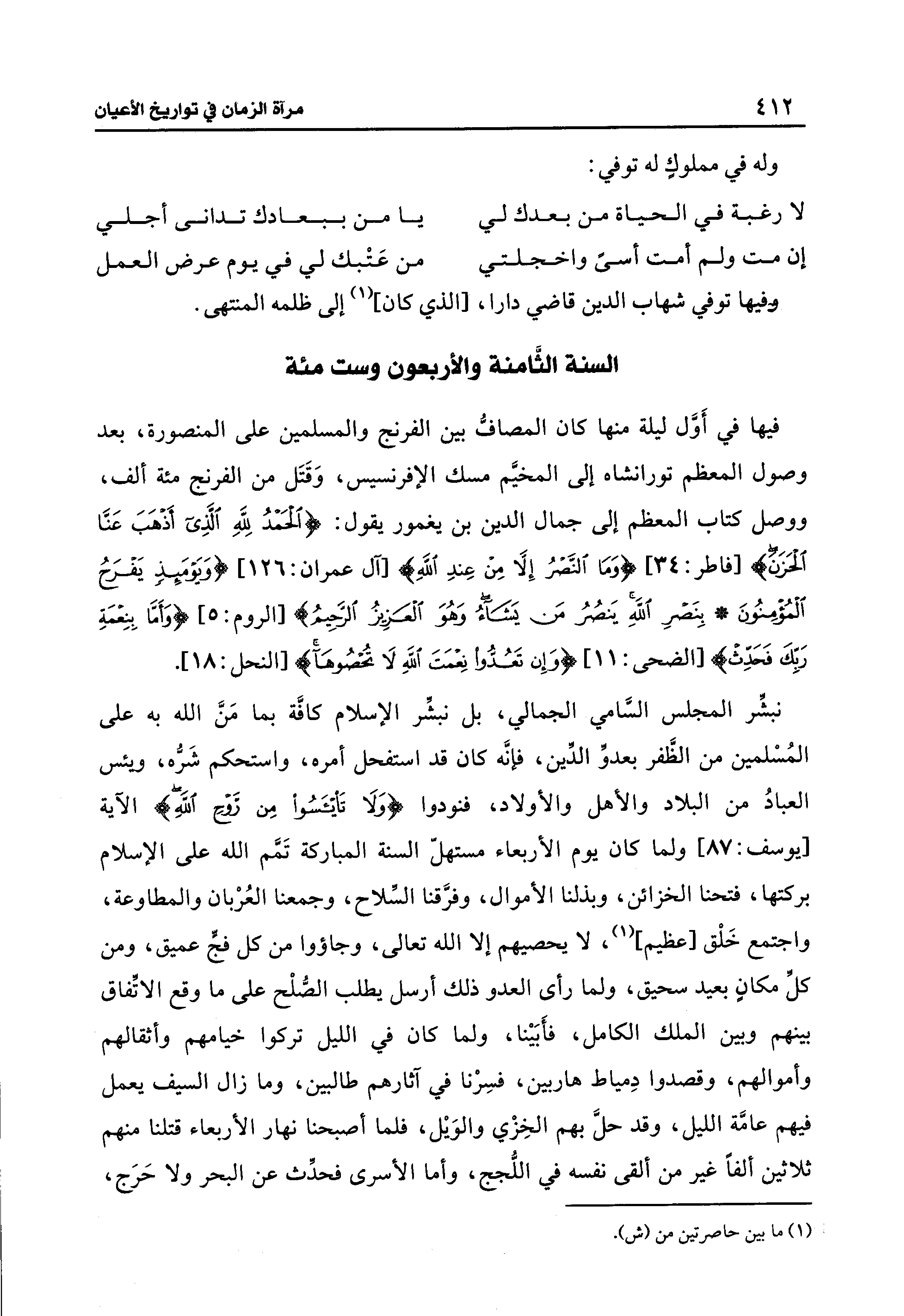فيها في أَوَّل ليلة منها كان المصافُّ بين الفرنج والمسلمين على المنصورة، بعد وصول المعظم تورانشاه إلى المخيَّم مسك الإفرنسيس، وَقَتَل من الفرنج مئة ألف، ووصل كتاب المعظم إلى جمال الدين بن يغمور يقول: {الْحَمْدُ لِلَّهِ الَّذِي أَذْهَبَ عَنَّا الْحَزَنَ} [فاطر: 34] {وَمَا النَّصْرُ إلا مِنْ عِنْدِ اللَّهِ} [آل عمران: 126] {وَيَوْمَئِذٍ يَفْرَحُ الْمُؤْمِنُونَ (4) بِنَصْرِ اللَّهِ يَنْصُرُ مَنْ يَشَاءُ وَهُوَ الْعَزِيزُ الرَّحِيمُ} [الروم: 4، 5] {وَأَمَّا بِنِعْمَةِ رَبِّكَ فَحَدِّثْ (11)} [الضحى: 11] {وَإِنْ تَعُدُّوا نِعْمَةَ اللَّهِ لَا تُحْصُوهَا} [النحل: 18].