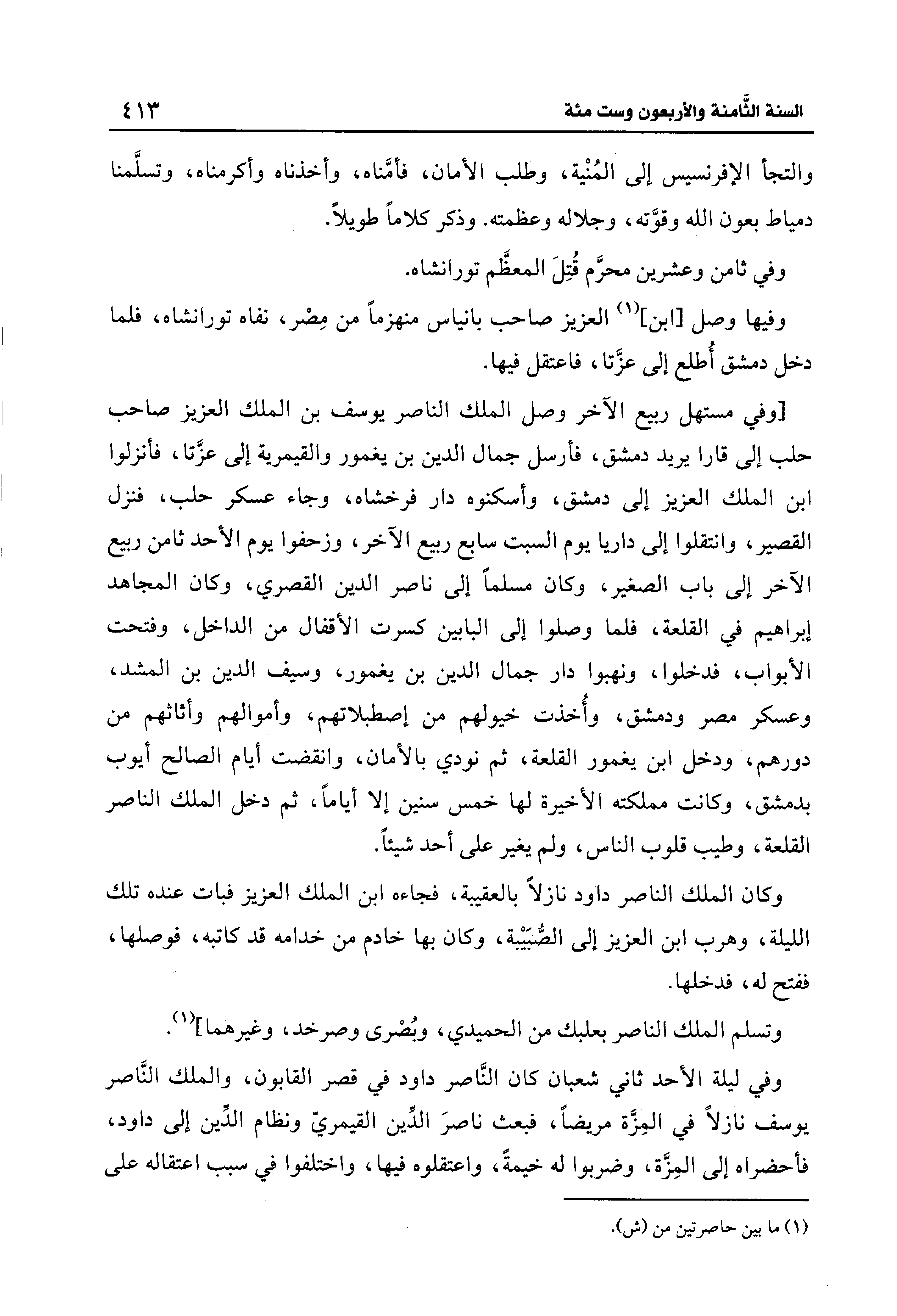 والتجأ الإفرنسيس إلى المُنْية، وطلب الأمان، فأمَّناه، وأخذناه وأكرمناه، وتسلَّمنا دمياط بعون الله وقوَّته، وجلاله وعظمته. وذكر كلامًا طويلًا.