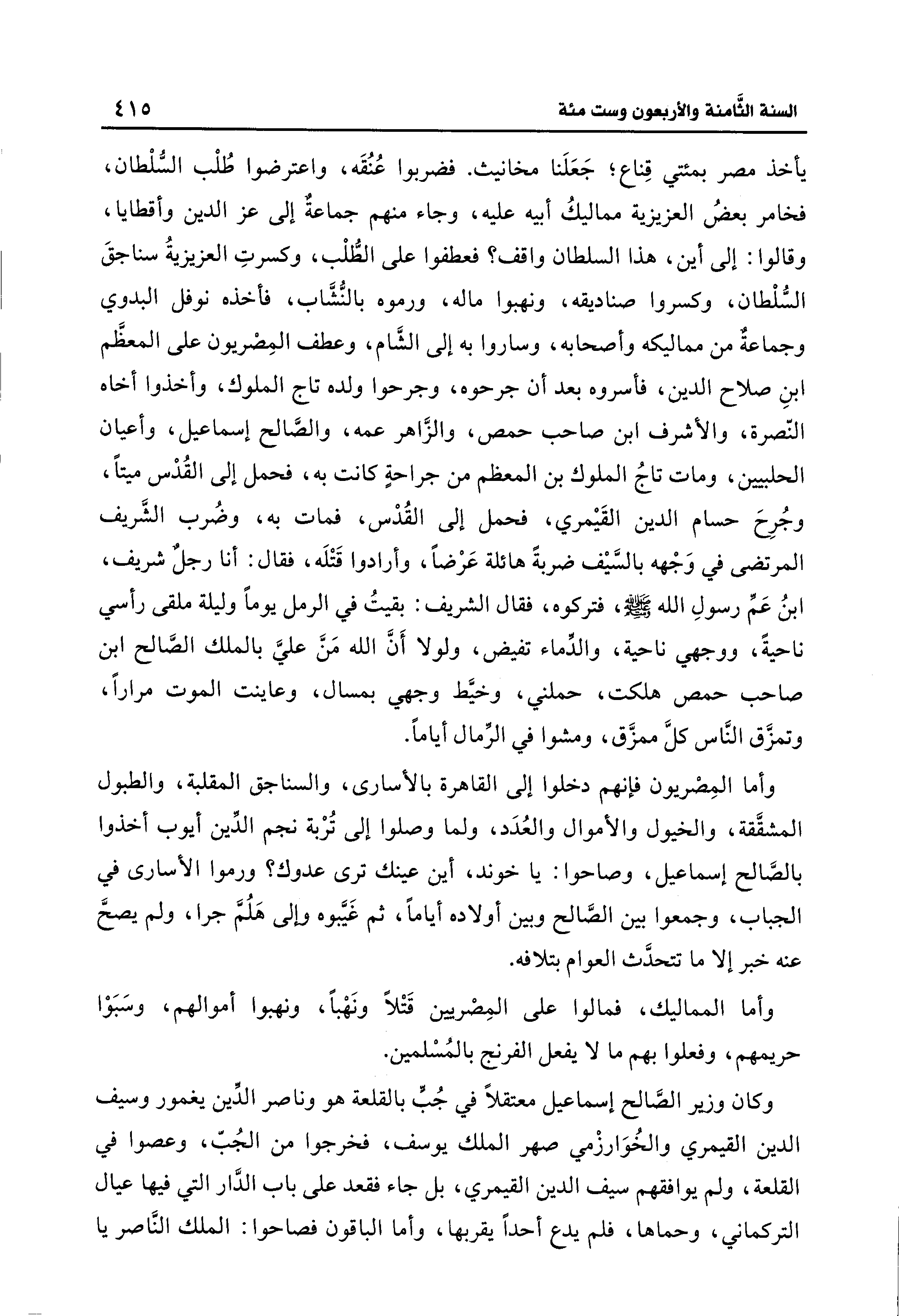يأخذ مصر بمئتي قِناع؛ جَعَلَنا مخانيث. فضربوا عُنُقَه، واعترضوا طُلْب السُّلْطان، فخامر بعضُ العزيزية مماليكُ أبيه عليه، وجاء منهم جماعةٌ إلى عز الدين وأقطايا، وقالوا: إلى أين، هذا السلطان واقف؟ فعطفوا على الطُّلْب، وكسرتِ العزيزيةُ سناجقَ السُّلْطان، وكسروا صناديقه، ونهبوا ماله، ورموه بالنُّشَّاب، فأخذه نوفل البدوي وجماعةٌ من مماليكه وأصحابه، وساروا به إلى الشَّام، وعطف المِصْريون على المعظَّم ابنِ صلاح الدين، فأسروه بعد أن جرحوه، وجرحوا ولده تاج الملوك، وأخذوا أخاه النُّصرة، والأشرف ابن صاحب حمص، والزَّاهر عمه، والصَّالح إسماعيل، وأعيان الحلبيين، ومات تاجُ الملوك بن المعظم من جراحةٍ كانت به، فحمل إلى القُدْس ميتًا، وجُرِحَ حسام الدين القَيمري، فحمل إلى القُدْس، فمات به، وضُرب الشَّريف المرتضى في وَجْهه بالسَّيف ضربةً هائلة عَرْضًا، وأرادوا قَتْلَه، فقال: أنا رجلٌ شريف، ابنُ عَمِّ رسولِ الله - صلى الله عليه وسلم -، فتركوه، فقال الشريف: بقيتُ في الرمل يومًا وليلة ملقى رأسي ناحيةً، ووجهي ناحية، والدِّماء تفيض، ولولا أَنَّ الله مَنَّ عليَّ بالملك الصَّالح ابن صاحب حمص هلكت، حملني، وخيَّط وجهي بمسال، وعاينت الموت مرارًا، وتمزَّق النَّاس كلَّ ممزَّق، ومشوا في الرِّمال أيامًا.