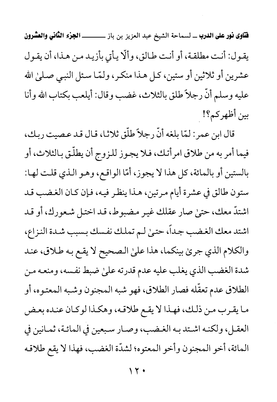 قال ابن عمر: لمّا بلغه أنّ رجلاً طلّق ثلاثا، قال قد عصيت ربك، فيما أمر به من طلاق امرأتك، فلا يجوز للزوج أن يطلّق بالثلاث، أو بالستين أو بالمائة، كل هذا لا يجوز، أمّا الواقع، وهو الذي قلت لها: ستون طالق في عشرة أيام مرتين، هذا ينظر فيه، فإن كان الغضب قد اشتدّ معك، حتى صار عقلك غير مضبوط، قد اختل شعورك، أو قد اشتد معك الغضب جدًّا، حتى لم تملك نفسك بسبب شدة النزاع، والكلام الذي جرى بينكما، هذا على الصحيح لا يقع به طلاق، عند شدة الغضب الذي يغلب عليه عدم قدرته على ضبط نفسه، ومنعه من الطلاق عدم تعقّله فصار الطلاق، فهو شبه المجنون وشبه المعتوه، أو ما يقرب من ذلك، فهذا لا يقع طلاقه، وهكذا لو كان عنده بعض العقل، ولكنه اشتد به الغضب، وصار سبعين في المائة، ثمانين في المائة، أخو المجنون وأخو المعتوه؛ لشدّة الغضب، فهذا لا يقع طلاقه