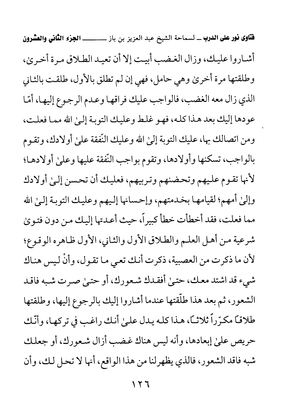 أشاروا عليك، وزال الغضب أبيت إلا أن تعيد الطلاق مرة أخرى، وطلقتها مرة أخرى، وهي حامل، فهي إن لم تطلق بالأول، طلقت بالثاني الذي زال معه الغضب، فالواجب عليك فراقها وعدم الرجوع إليها، أمّا عودها إليك بعد هذا كله، فهو غلط وعليك التوبة إلى الله مما فعلت، ومن اتصالك بها، عليك التوبة إلى الله وعليك النّفقة على أولادك، وتقوم بالواجب، تسكنها وأولادها، وتقوم بواجب النّفقة عليها وعلى أولادها؛ لأنها تقوم عليهم وتحضنهم وتربيهم، فعليك أن تحسن إلى أولادك وإلى أمهم؛ لقيامها بخدمتهم، وإحسانها إليهم وعليك التوبة إلى الله مما فعلت، فقد أخطأت خطأ كبيرًا، حيث أعدتها إليك من دون فتوى شرعية من أهل العلم والطلاق الأول والثاني، الأول ظاهره الوقوع؛ لأن ما ذكرت من العصبية، ذكرت أنك تعي ما تقول، وأنْ ليس هناك شيء قد اشتد معك، حتى أفقدك شعورك، أو حتى صرت شبه فاقد الشعور، ثم بعد هذا طلّقتها عندما أشاروا إليك بالرجوع إليها، وطلقتها طلاقًا مكررًا ثلاثًا، هذا كله يدل على أنك راغب في تركها، وأنّك حريص على إبعادها، وأنه ليس هناك غضب أزال شعورك، أو جعلك شبه فاقد الشعور، فالذي يظهر لنا من هذا الواقع، أنها لا تحل لك، وأن