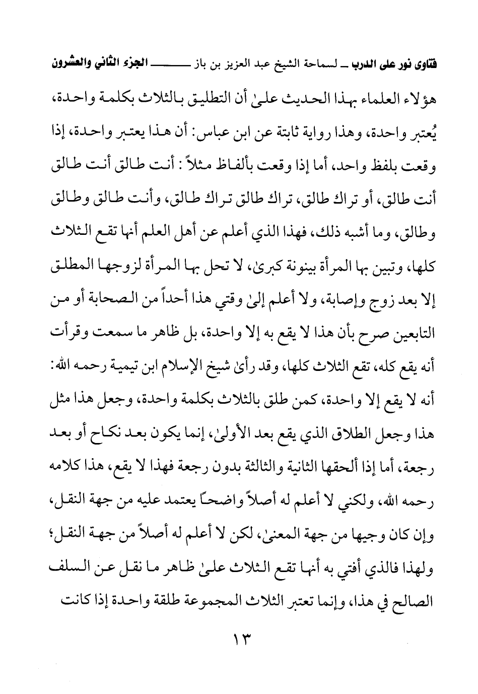 هؤلاء العلماء بهذا الحديث على أن التطليق بالثلاث كلمة واحدة، يُعتبر واحدة، وهذا رواية ثابتة عن ابن عباس: أن هذا يعتبر واحدة، إذا وقعت بلفظ واحد، أما إذا وقعت بألفاظ مثلاً: أنت طالق أنت طالق أنت طالق، أو تراك طالق، تراك طالق تراك طالق، وأنت طالق وطالق وطالق، وما أشبه ذلك، فهذا الذي أعلم عن أهل العلم أنها تقع الثلاث كلها، وتبين بها المرأة بينونة كبرى، لا تحل بها المرأة لزوجها المطلق إلا بعد زوج وإصابة، ولا أعلم إلى وقتي هذا أحدًا من الصحابة أو من التابعين رح بأن هذا لا يقع به إلا واحدة، بل ظاهر ما سمعت وقرأت أنه يقع كله، تقع الثلاث كلها، وقد رأى شيخ الإسلام ابن تيمية رحمه الله: أنه لا يقع إلا واحدة، كمن طلق بالثلاث بكلمة واحدة، وجعل هذا مثل هذا وجعل الطلاق الذي يقع بعد الأولى، إنما يكون بعد نكاح أو بعد رجعة، أما إذا ألحقها الثانية والثالثة بدون رجعة فهذا لا يقع، هذا كلامه رحمه الله، ولكني لا أعلم له أصلاً واضحًا يعتمد عليه من جهة النقل، وإن كان وجيها من جهة المعنى، لكن لا أعلم له أصلاً من جهة النقل؛ ولهذا فالذي أفتي به أنها تقع الثلاث على ظاهر ما نقل عن السلف الصالح في هذا، وإنما تعتبر الثلاث المجموعة طلقة واحدة إذا كانت