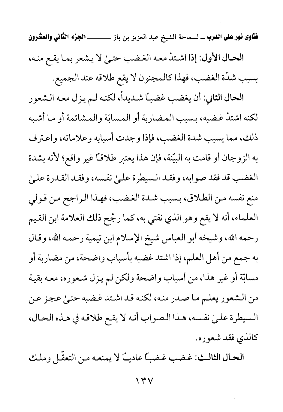 الحال الثاني: أن يغضب غضبًا شديدًا، لكنه لم يزل معه الشعور لكنه اشتدّ غضبه، بسبب المضاربة أو المسابّة والمشاتمة أو ما أشبه ذلك، مما يسبب شدة الغضب، فإذا وجدت أسبابه وعلاماته، واعترف به الزوجان أو قامت به البيّنة، فإن هذا يعتبر طلاقًا غير واقع؛ لأنه بشدة الغضب قد فقد صوابه، وفقد السيطرة على نفسه، وفقد القدرة على منع نفسه من الطلاق، بسبب شدة الغضب، فهذا الراجح من قولي العلماء، أنه لا يقع وهو الذي نفتي به، كما رجّح ذلك العلامة ابن القيم رحمه الله، وشيخه أبو العباس شيخ الإسلام ابن تيمية رحمه الله، وقال به جمع من أهل العلم، إذا اشتد غضبه بأسباب واضحة، من مضاربة أو مسابّة أو غير هذا، من أسباب واضحة ولكن لم يزل شعوره، معه بقية من الشعور يعلم ما صدر منه، لكنه قد اشتد غضبه حتى عجز عن السيطرة على نفسه، هذا الصواب أنه لا يقع طلاقه في هذه الحال، كالذي فقد شعوره.