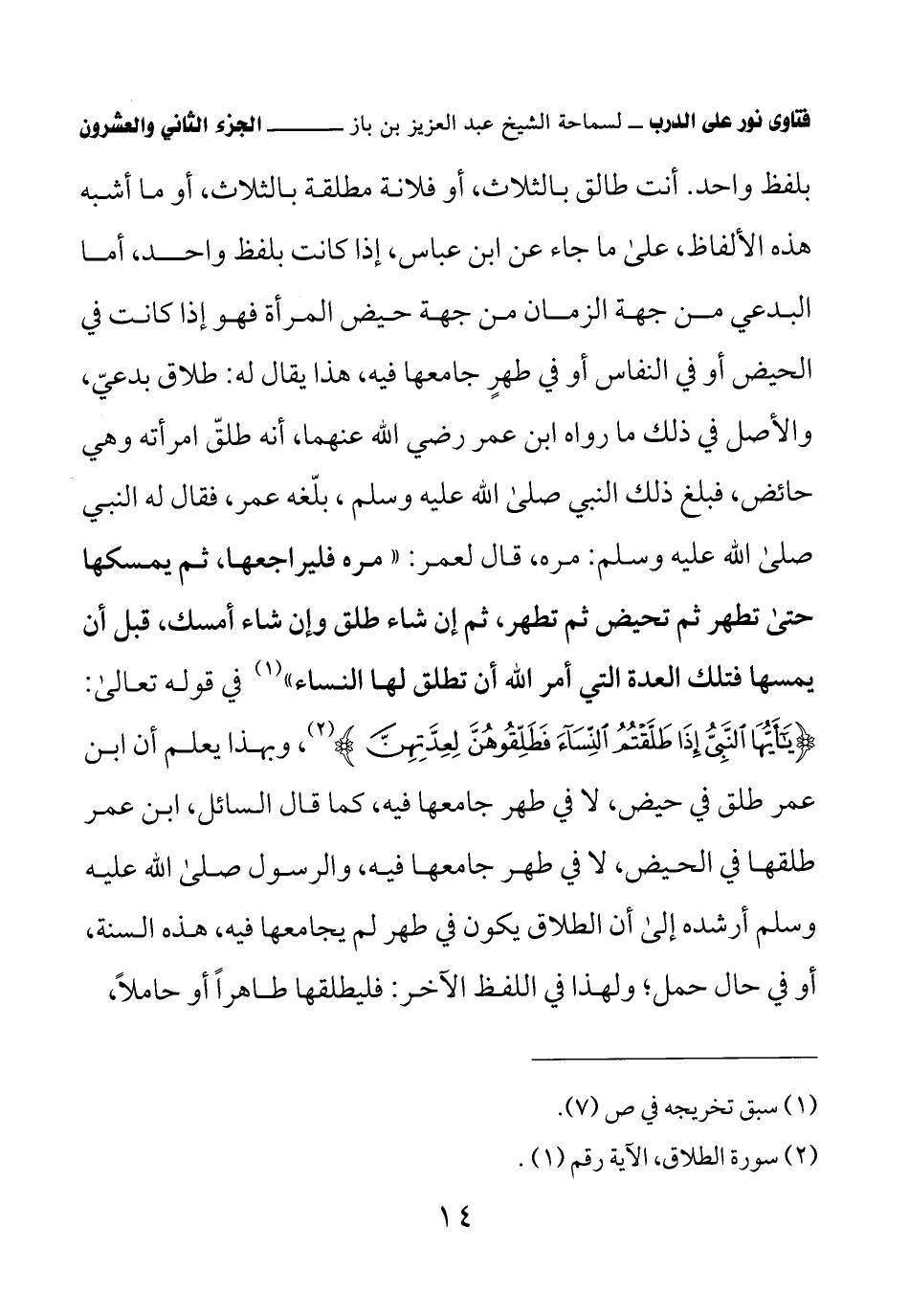 بلفظ واحد. أنت طالق بالثلاث، أو فلانة مطلقة بالثلاث، أو ما أشبه هذه الألفاظ، على ما جاء عن ابن عباس، إذا كانت بلفظ واحد، أما البدعي من جهة الزمان من جهة حيض المرأة فهو إذا كانت في الحيض أو في النفاس أو في طهرٍ جامعها فيه، هذا يقال له: طلاق بدعيّ، والأصل في ذلك ما رواه ابن عمر رضي الله عنهما، أنه طلّق امرأته وهي حائض، فبلغ ذلك النبي صلى الله عليه وسلم، بلّغه عمر، فقال له النبي صلى الله عليه وسلم: مره، قال لعمر: «مره فليراجعها، ثم يمسكها حتى تطهر ثم تحيض ثم تطهر، ثم إن شاء طلق وإن شاء أمسك، قبل أن يمسها فتلك العدة التي أمر الله أن تطلق لها النساء» (¬1) في قوله تعالى: {يَا أَيُّهَا النَّبِيُّ إِذَا طَلَّقْتُمُ النِّسَاءَ فَطَلِّقُوهُنَّ لِعِدَّتِهِنَّ}، وبهذا يعلم أن ابن عمر طلق في حيض، لا في طهر جامعها فيه، كما قال السائل، ابن عمر طلقها في الحيض، لا في طهر جامعها فيه، والرسول صلى الله عليه وسلم أرشده إلى أن الطلاق يكون في طهر لم يجامعها فيه، هذه السنة، أو في حال حمل؛ ولهذا في اللفظ الآخر: فليطلقها طاهرًا أو حاملاً،