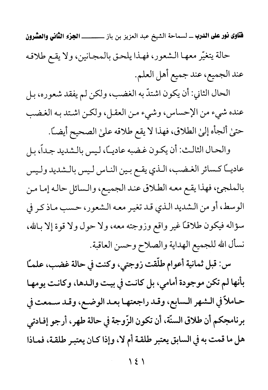 والحال الثالث: أن يكون غضبه عاديًّا، ليس بالشديد جدًّا، بل عاديًّا كسائر الغضب، الذي يقع بين الناس ليس بالشديد وليس بالملجئ، فهذا يقع معه الطلاق عند الجميع، والسائل حاله إما من الوسط، أو من الشديد الذي قد تغير معه الشعور، حسب ما ذكر في سؤاله فيكون طلاقًا غير واقع وزوجته معه، ولا حول ولا قوة إلا بالله، نسأل الله للجميع الهداية والصلاح وحسن العاقبة.