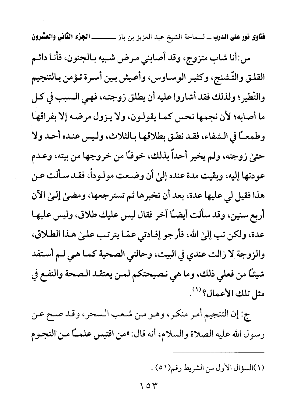س: أنا شاب متزوج، وقد أصابني مرض شبيه بالجنون، فأنا دائم القلق والتّشنج، وكثير الوساوس، وأعيش بين أسرة تؤمن بالتنجيم والتّطير؛ ولذلك فقد أشاروا عليه أن يطلق زوجته، فهي السبب في كل ما أصابه؛ لأن نجمها نحس كما يقولون، ولا يزول مرضه إلا بفراقها وطمعًا في الشفاء، فقد نطق بطلاقها بالثلاث، وليس عنده أحد ولا حتى زوجته، ولم يخبر أحدًا بذلك، خوفًا من خروجها من بيته، وعدم عودتها إليه، وبقيت مدة عنده إلى أن وضعت مولودًا، فقد سألت عن هذا فقيل لي عليها عدة، بعد أن تخبرها ثم تسترجعها، ومضى إلى الآن أربع سنين، وقد سألت أيضًا آخر فقال ليس عليك طلاق، وليس عليها عدة، ولكن تب إلى الله، فأرجو إفادتي عمّا يترتب على هذا الطلاق، والزوجة لا زالت عندي في البيت، وحالتي الصحية كما هي لم أستفد شيئًا من فعلي ذلك، وما هي نصيحتكم لمن يعتقد الصحة والنفع في مثل تلك الأعمال؟ (¬1)