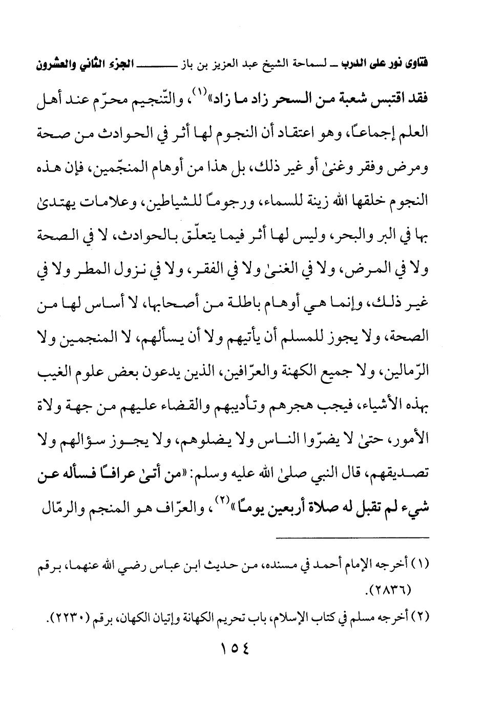 فقد اقتبس شعبة من السحر زاد ما زاد» (¬1) والتّنجيم محرّم عند أهل العلم إجماعًا، وهو اعتقاد أن النجوم لها أثر في الحوادث من صحة ومرض وفقر وغنى أو غير ذلك، بل هذا من أوهام المنجّمين، فإن هذه النجوم خلقها الله زينة للسماء، ورجومًا للشياطين، وعلامات يهتدى بها في البر والبحر، وليس لها أثر فيما يتعلق بالحوادث، لا في الصحة ولا في المرض، ولا في الغنى ولا في الفقر، ولا في نزول المطر ولا في غير ذلك، وإنما هي أوهام باطلة من أصحابها، لا أساس لها من الصحة، ولا يجوز للمسلم أن يأتيهم ولا أن يسألهم، لا المنجمين ولا الرّمالين، ولا جميع الكهنة والعرّافين، الذين يدعون بعض علوم الغيب بهذه الأشياء، فيجب هجرهم وتأديبهم والقضاء عليهم من جهة ولاة الأمور، حتى لا يضرّوا الناس ولا يضلوهم، ولا يجوز سؤالهم ولا تصديقهم، قال النبي صلى الله عليه وسلم: «من أتى عرافًا فسأله عن شيء لم تقبل له صلاة أربعين يومًا» (¬2) والعرّاف هو المنجم والرمّال