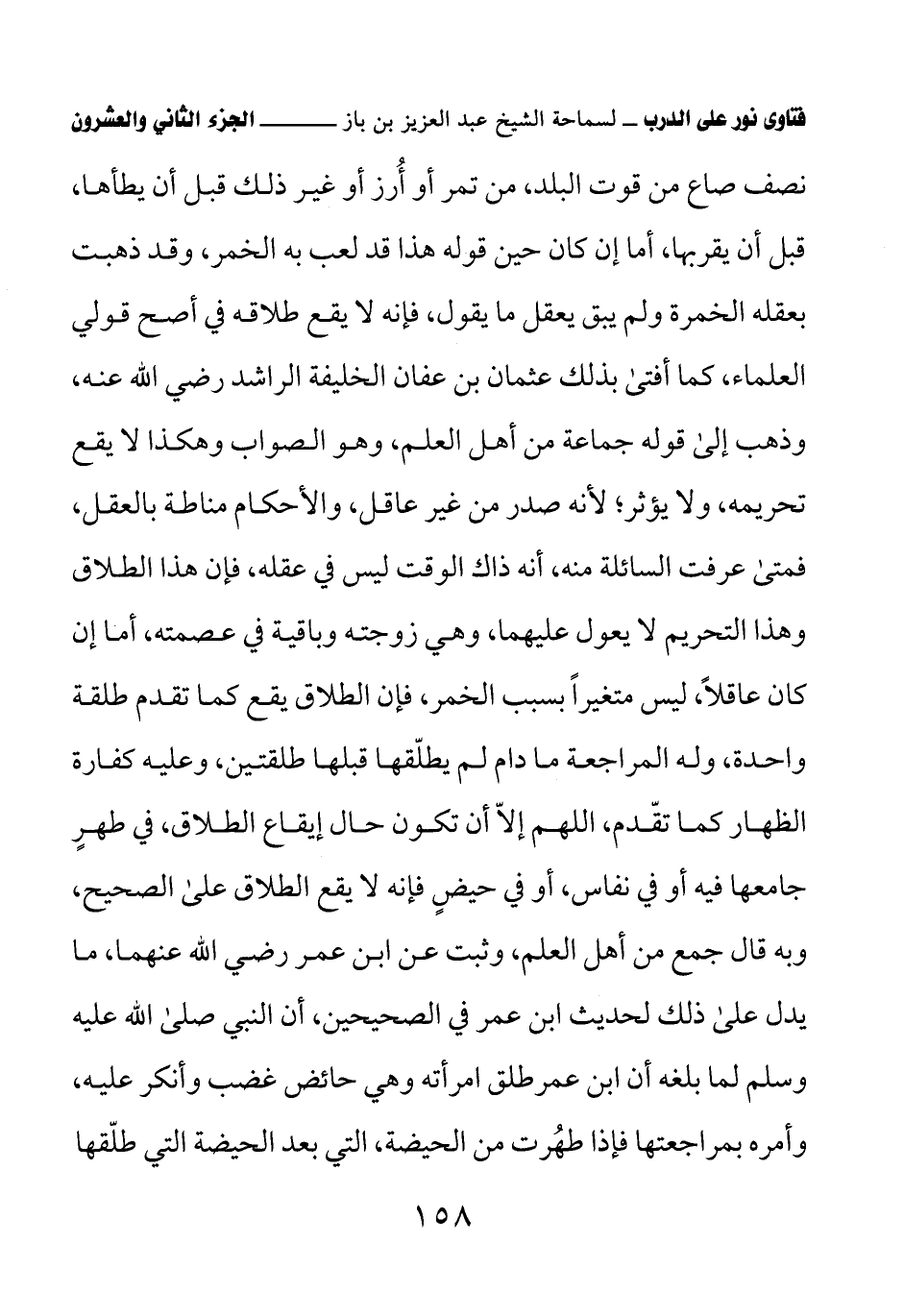 نصف صاع من قوت البلد، من تمر أو أرز أو غير ذلك قبل أن يطأها، قبل أن يقربها، أما إن كان حين قوله هذا قد لعب به الخمر، وقد ذهبت بعقله الخمرة ولم يبق يعقل ما يقول، فإنه لا يقع طلاقه في أصح قولي العلماء، كما أفتى بذلك عثمان بن عفان الخليفة الراشد رضي الله عنه، وذهب إلى قوله جماعة من أهل العلم، وهو الصواب وهكذا لا يقع تحريمه، ولا يؤثر؛ لأن صدر من غير عاقل، والأحكام مناطة بالعقل، فمتى عرفت السائلة منه، أنه ذاك الوقت ليس في عقله، فإن هذا الطلاق وهذا التحريم لا يعول عليهما، وهي زوجته وباقية في عصمته، أما إن كان عاقلاً، ليس متغيرًا بسبب الخمر، فإن الطلاق يقع كما تقدم طلقة واحدة، وله المراجعة ما دام لم يطلّقها قبلها طلقتين، وعليه كفارة الظهار كما تقدّم، اللهم إلاّ أن تكون حال إيقاع الطلاق، في طهرٍ جامعها فيه أو في نفاس، أو في حيضٍ فإنه لا يقع الطلاق على الصحيح، وبه قال جمع من أهل العلم، وثبت عن ابن عمر رضي الله عنهما، ما يدل على ذلك لحديث ابن عمر في الصحيحين، أن النبي صلى الله عليه وسلم لما بلغه أن ابن عمر طلق امرأته وهي حائض غضب وأنكر عليه، وأمره بمراجعتها فإذا طهُرت من الحيضة، التي بعد الحيضة التي طلّقها