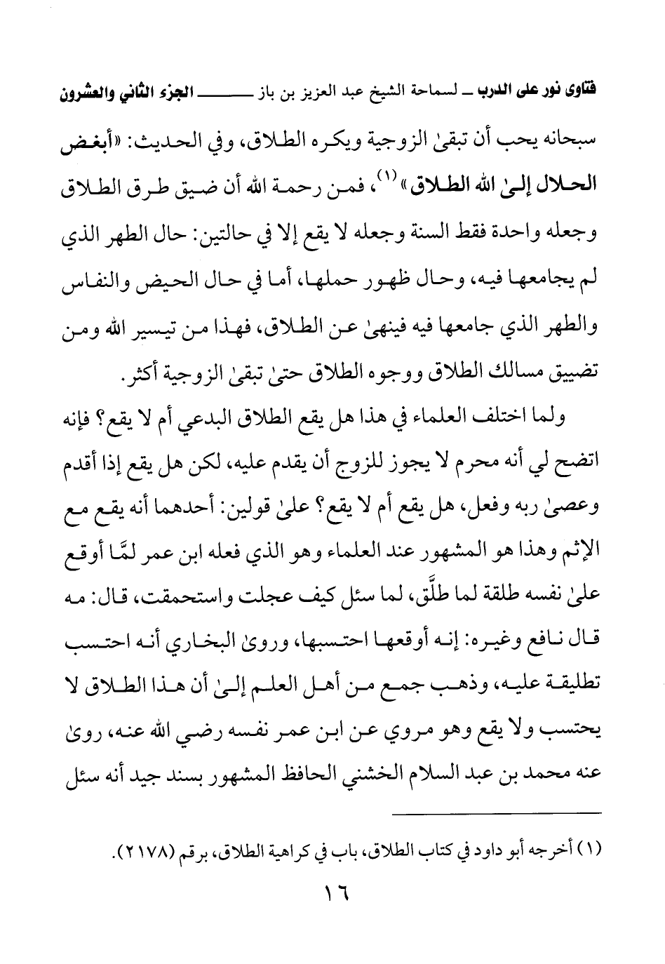 ولما اختلف العلماء في هذا هل يقع الطلاق البدعي أم لا يقع؟ فإنه اتضح لي أنه محرم لا يجوز للزوج أن يقدم عليه، لكن هل يقع إذا أقدم وعصى ربه وفعل، هل يقع أم لا يقع؟ على قولين: أحدهما أنه يقع مع الإثم وهذا هو المشهور عند العلماء وهو الذي فعله ابن عمر لمَّا أوقع على نفسه طلقة لما طلَّق، لما سئل كيف عجلت واستحمقت، قال: مه قال نافع وغيره: إنه أوقعها احتسبها، وروى البخاري أنه احتسب تطليقة عليه، وذهب جمع من أهل العلم إلى أن هذا الطلاق لا يحتسب ولا يقع وهو مروي عن ابن عمر نفسه رضي الله عنه، روى عنه محمد بن عبد السلام الخشني الحافظ المشهور بسند جيد أنه سئل