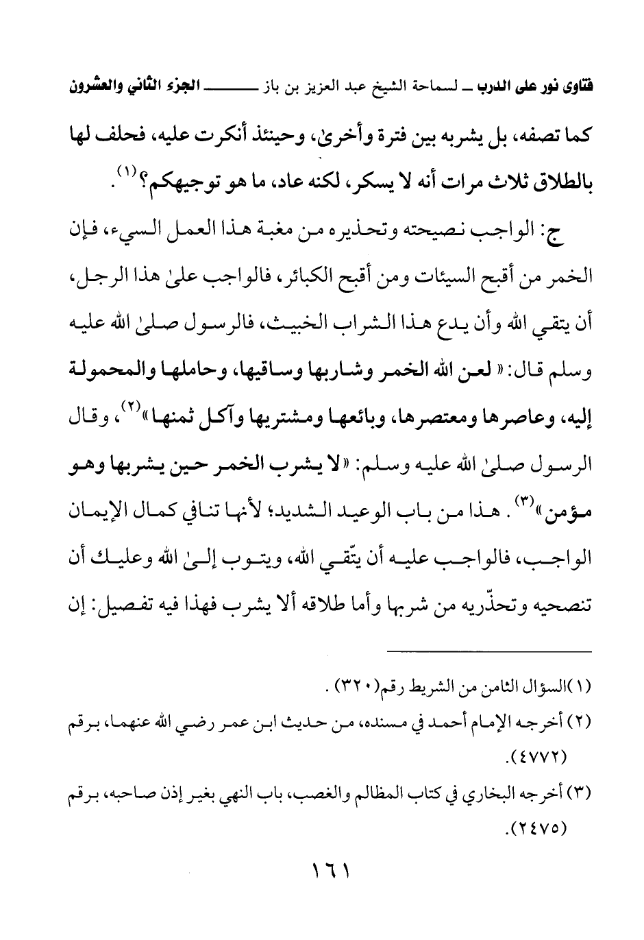 ج: الواجب نصيحته وتحذيره من مغبة هذا العمل السيئ، فإن الخمر من أقبح السيئات ومن أقبح الكبائر، فالواجب على هذا الرجل، أن يتقي الله وأن يدع هذا الشراب الخبيث، فالرسول صلى الله عليه وسلم قال: «لعن الله الخمر وشاربها وساقيها، وحاملها والمحمولة إليه، وعاصرها ومعتصرها، وبائعها ومشتريها وآكل ثمنها» (¬2) وقال الرسول صلى الله عليه وسلم: «لا يشرب الخمر حين يشربها وهو مؤمن» (¬3) هذا من باب الوعيد الشديد؛ لأنها تنافي كمال الإيمان الواجب، فالواجب عليه أن يتّقي الله، ويتوب إلى الله وعليك أن تنصحيه وتحذّريه من شربها وأما طلاقه ألا يشرب فهذا فيه تفصيل: إن