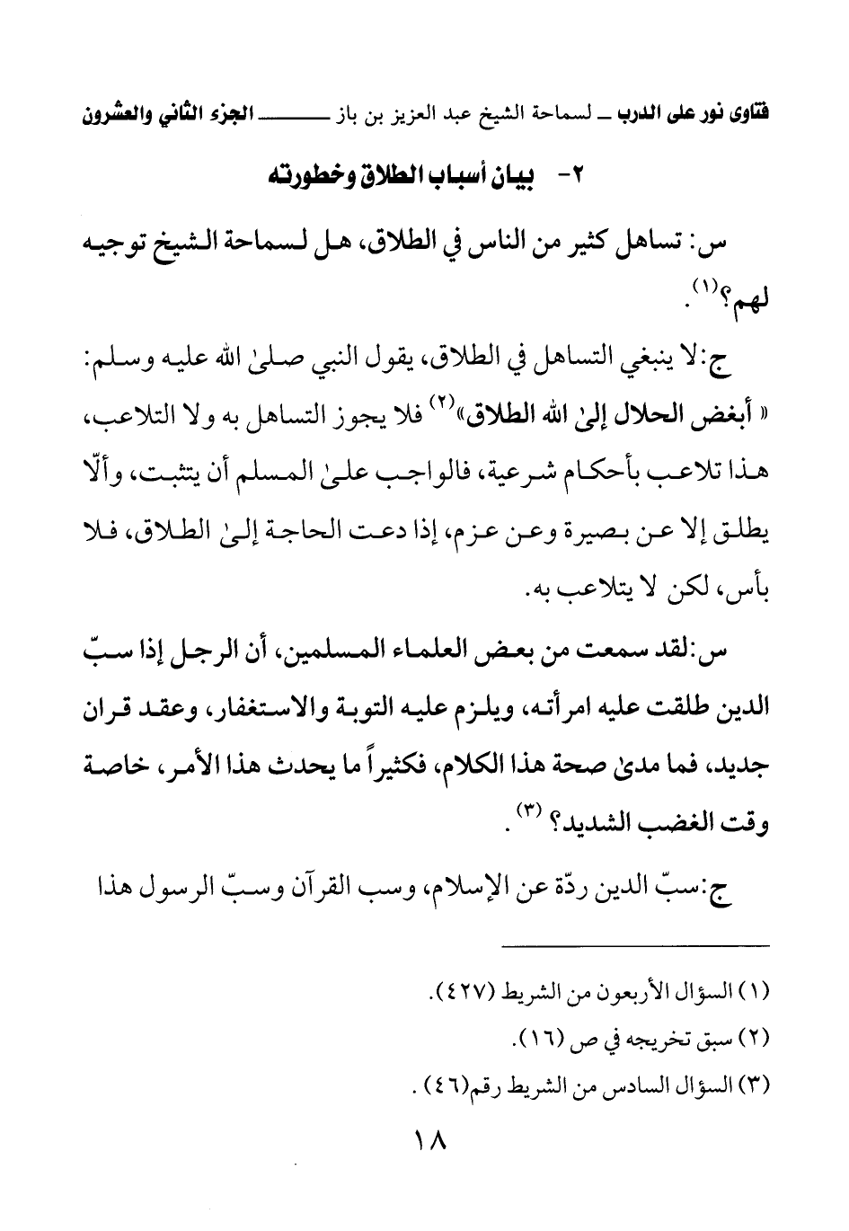 ج: لا ينبغي التساهل في الطلاق، يقول النبي صلى الله عليه وسلم: «أبغض الحلال إلى الله الطلاق» (¬2) فلا يجوز التساهل به ولا التلاعب، هذا تلاعب بأحكام شرعية، فالواجب على المسلم أن يتثبت، وألاّ يطلق إلا عن بصيرة وعن عزم، إذا دعت الحاجة إلى الطلاق، فلا بأس، لكن لا يتلاعب به.
