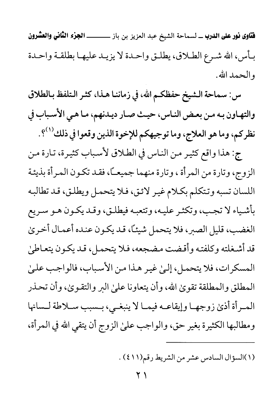 س: سماحة الشيخ حفظكم الله، في زماننا هذا، كثر التلفظ بالطلاق والتهاون به من بعض الناس، حيث صار ديدنهم، ما هي الأسباب في نظركم، وما هو العلاج، وما توجيهكم للإخوة الذين وقعوا في ذلك (¬1)؟