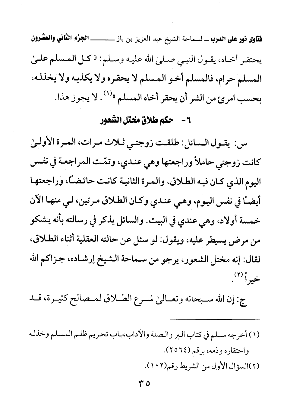 س: يقول السائل: طلقت زوجتي ثلاث مرات، المرة الأولى، كانت زوجتي حاملاً وراجعتها وهي عندي، وتمت المراجعة في نفس اليوم الذي كان فيه الطلاق، والمرة الثانية كانت حائضًا، وراجعتها أيضًا في نفس اليوم، وهي عندي وكان الطلاق مرتين، لي منها الآن خمسة أولاد، وهي عندي في البيت. والسائل يذكر في رسالته بأنه يشكو من مرض يسيطر عليه، ويقول: لو سئل عن حالته العقلية أثناء الطلاق، لقال: إنه مختل الشعور، يرجو من سماحة الشيخ إرشاده، جزاكم الله خيرًا (¬1)