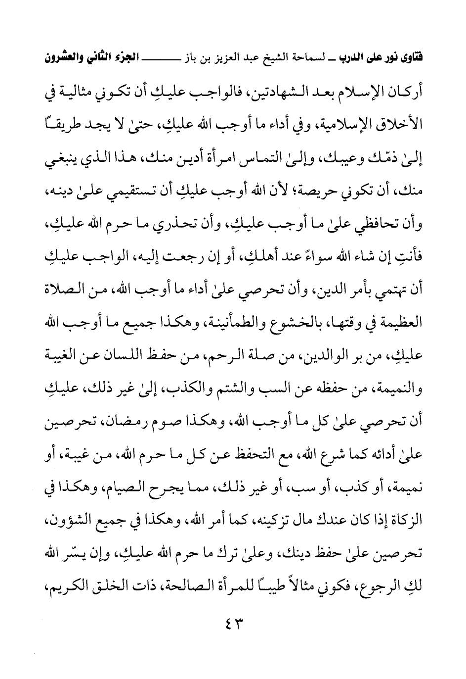 أركان الإسلام بعد الشهادتين، فالواجب عليكِ أن تكوني مثالية في الأخلاق الإسلامية، وفي أداء ما أوجب الله عليكِ، حتى لا يجد طريقًا إلى ذمّك وعيبك، وإلى التماس امرأة أدين منك، هذا الذي ينبغي منك، أن تكوني حريصة؛ لأن الله أوجب عليكِ أن تستقيمي على دينه، وأن تحافظي على ما أوجب عليكِ، وأن تحذري ما حرم الله عليكِ، فأنتِ إن شاء الله سواءً عند أهلكِ، أو إن رجعت إليه، الواجب عليكِ أن تهتمي بأمر الدين، وأن تحرصي على أداء ما أوجب الله، من الصلاة العظيمة في وقتها، بالخشوع والطمأنينة، وهكذا جميع ما أوجب الله عليكِ، من بر الوالدين، من صلة الرحم، من حظ اللسان عن الغيبة والنميمة، من حفظه عن السب والشتم والكذب، إلى غير ذلك، عليكِ أن تحرصي على كل ما أوجب الله، وهكذا صوم رمضان، تحرصين على أدائه كما شرع الله، مع التحفظ عن كل ما حرم الله، من غيبة، أو نميمة، أو كذب، أو سب، أو غير ذلك، مما يجرح الصيام، وهكذا في الزكاة إذا كان عندك مال تزكينه، كما أمر الله، وهكذا في جميع الشؤون، تحرصين على حفظ دينك، وعلى ترك ما حرم الله عليكِ، وإن يسّر الله لكِ الرجوع، فكوني مثالاً طيبًا للمرأة الصالحة، ذات الخلق الكريم،