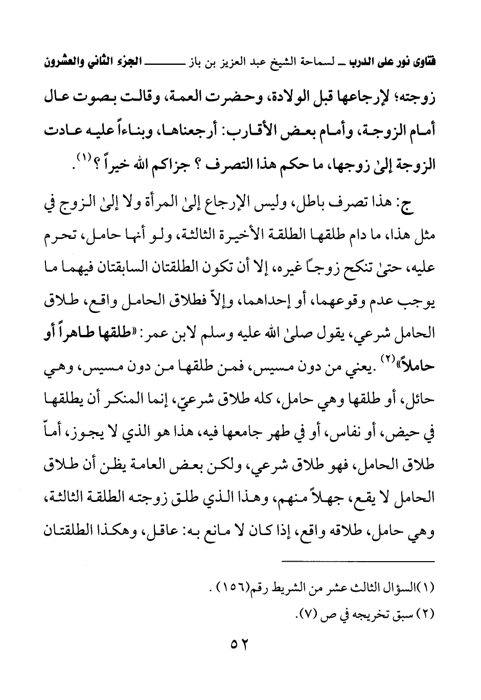 ج: هذا تصرف باطل، وليس الإرجاع إلى المرأة ولا إلى الزوج في مثل هذا، ما دام طلقها الطلقة الأخيرة الثالثة، ولو أنها حامل، تحرم عليه، حتى تنكح زوجًا غيره، إلا أن تكون الطلقتان السابقتان فيهما ما يوجب عدم وقوعهما، أو إحداهما، وإلاّ فطلاق الحامل واقع، طلاق الحامل شرعي، يقول صلى الله عليه وسلم لابن عمر: «طلقها طاهرًا أو حاملاً» (¬2) يعني من دون مسيس، فمن طلقها من دون مسيس، وهي حائل، أو طلقها وهي حامل، كله طلاق شرعيّ، إنما المنكر أن يطلقها في حيض، أو نفاس، أو في طهر جامعها فيه، هذا هو الذي لا يجوز، أمّا طلاق الحامل، فهو طلاق شرعي، ولكن بعض العامة يظن أن طلاق الحامل لا يقع، جهلاً منهم، وهذا الذي طلق زوجته الطلقة الثالثة، وهي حامل، طلاقه واقع، إذا كان لا مانع به: عاقل، وهكذا الطلقتان