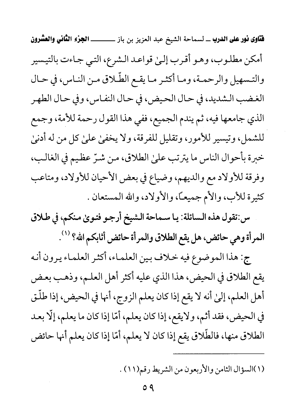 س: تقول هذه السائلة: يا سماحة الشيخ أرجو فتوى منكم، في طلاق المرأة وهي حائض، هل يقع الطلاق والمرأة حائض أثابكم الله؟ (¬1)