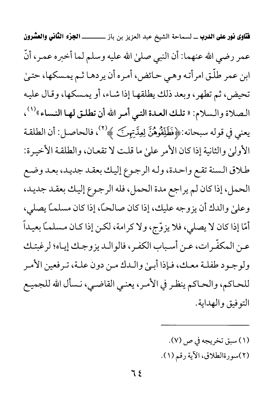 عمر رضي الله عنهما: أن النبي صلى الله عليه وسلم لما أخبره عمر، أنّ ابن عمر طلّق امرأته وهي حائض، أمره أن يردها ثم يمسكها، حتى تحيض، ثم تطهر، وبعد ذلك يطلقها إذا شاء، أو يمسكها، وقال عله الصلاة والسلام: «تلك العدة التي أمر الله أن تطلق لها النساء» (¬1) يعني في قوله سبحانه: {فَطَلِّقُوهُنَّ لِعِدَّتِهِنَّ}، فالحاصل: أن الطلقة الأولى والثانية إذا كان الأمر على ما قلت لا تقعان، والطلقة الأخيرة: طلاق السنة تقع واحدة، وله الرجوع إليك بعقد جديد، بعد وضع الحمل، إذا كان لم يراجع مدة الحمل، فله الرجوع إليك بعقد جديد، وعلى والدك أن يزوجه عليك، إذا كان صالحًا، إذا كان مسلمًا يصلي، أمّا إذا كان لا يصلي، فلا يزوّج، ولا كرامة، لكن إذا كان مسلمًا بعيدًا عن المكفّرات، عن أسباب الكفر، فالوالد يزوجك إياه؛ لرغبتك ولوجود طفلة معك، فإذا أبى والدك من دون علة، ترفعين الأمر للحاكم، والحاكم ينظر في الأمر، يعني القاضي، نسأل الله للجميع التوفيق والهداية.